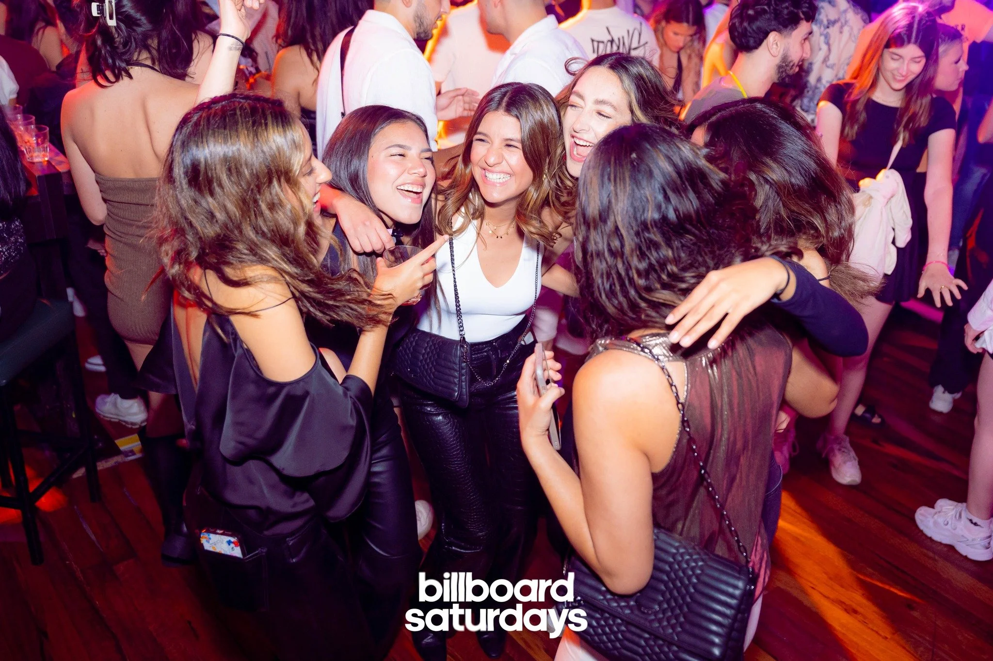 Group of women smiling and posing at a club event, labeled 'billboard saturdays'. People dancing and socializing in the background.