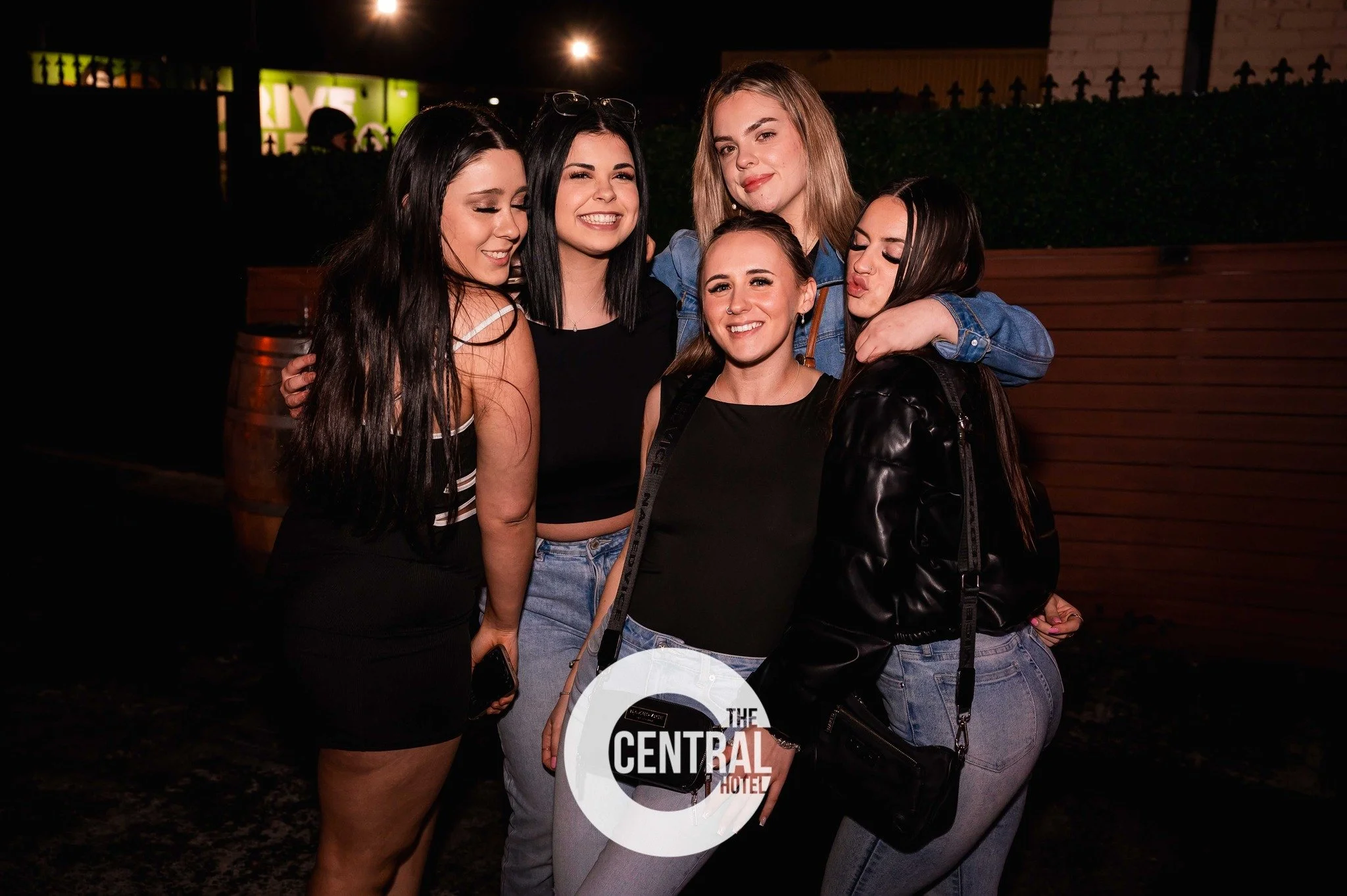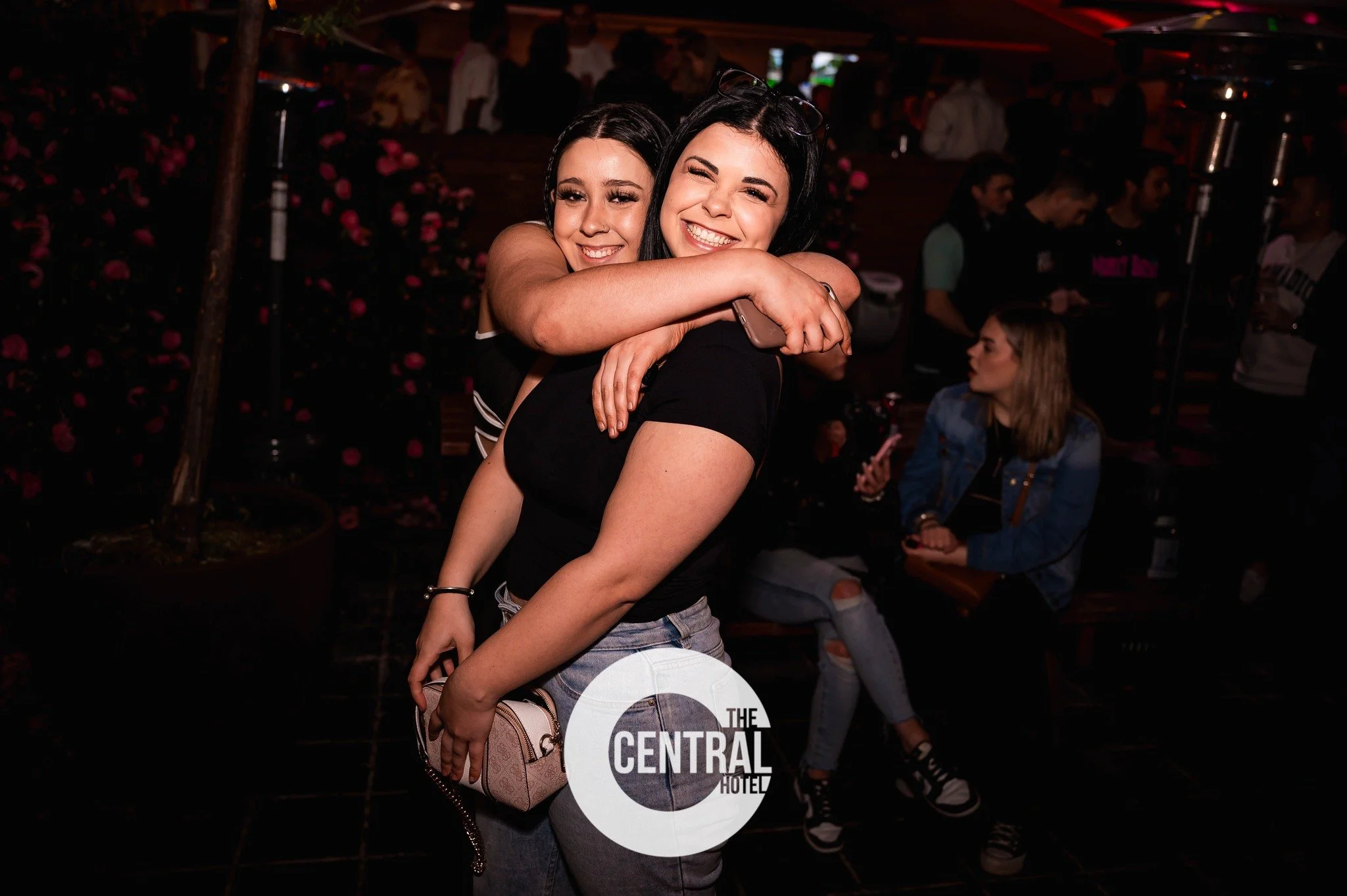 Two women hugging and smiling at a nightlife venue with people and flowers in the background, "The Central Hotel" logo visible.