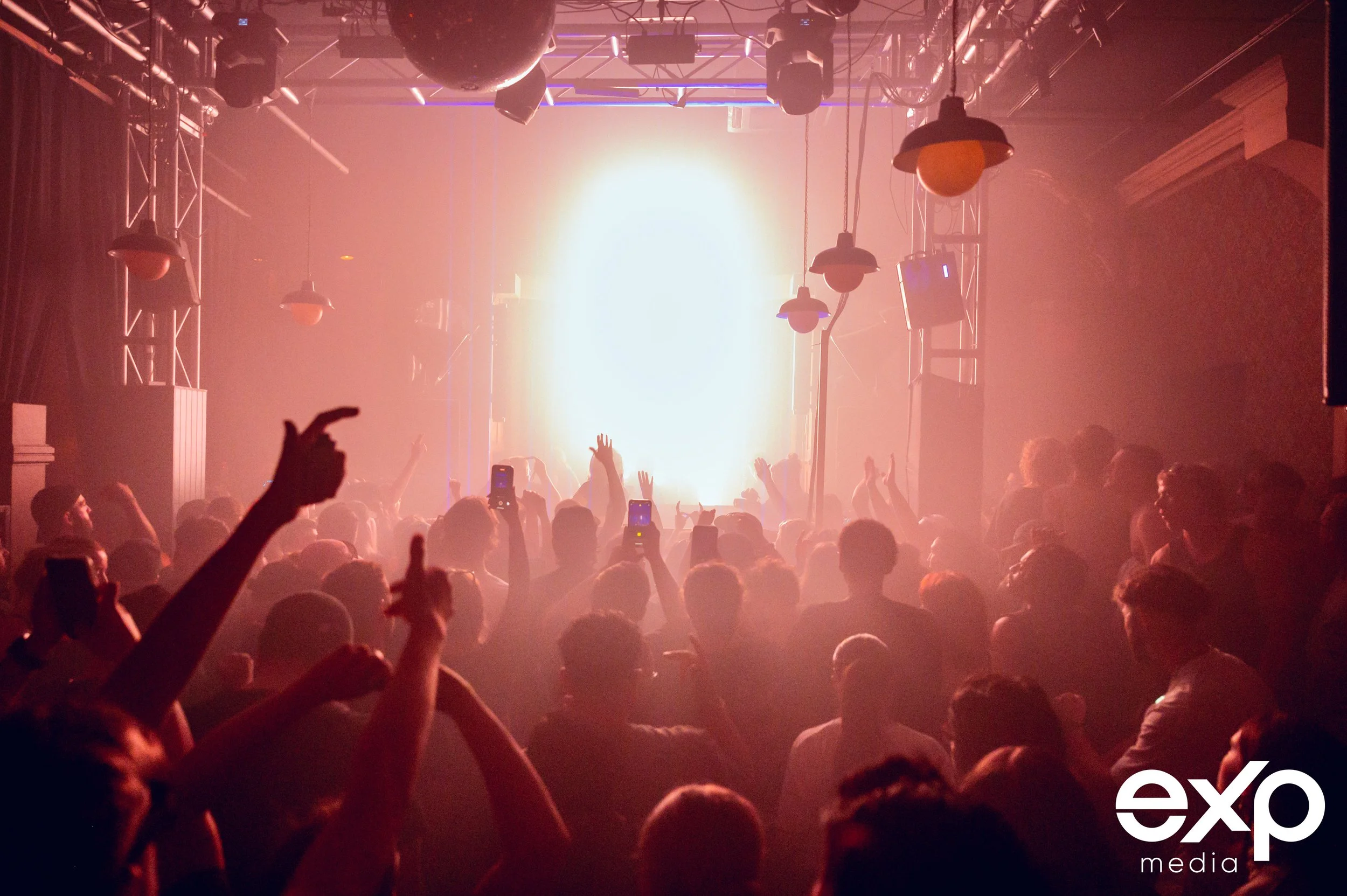 Person in black outfit with crown on stage at nightclub, surrounded by cheering crowd, colorful lights, and futuristic decor, "exp media" logo visible.