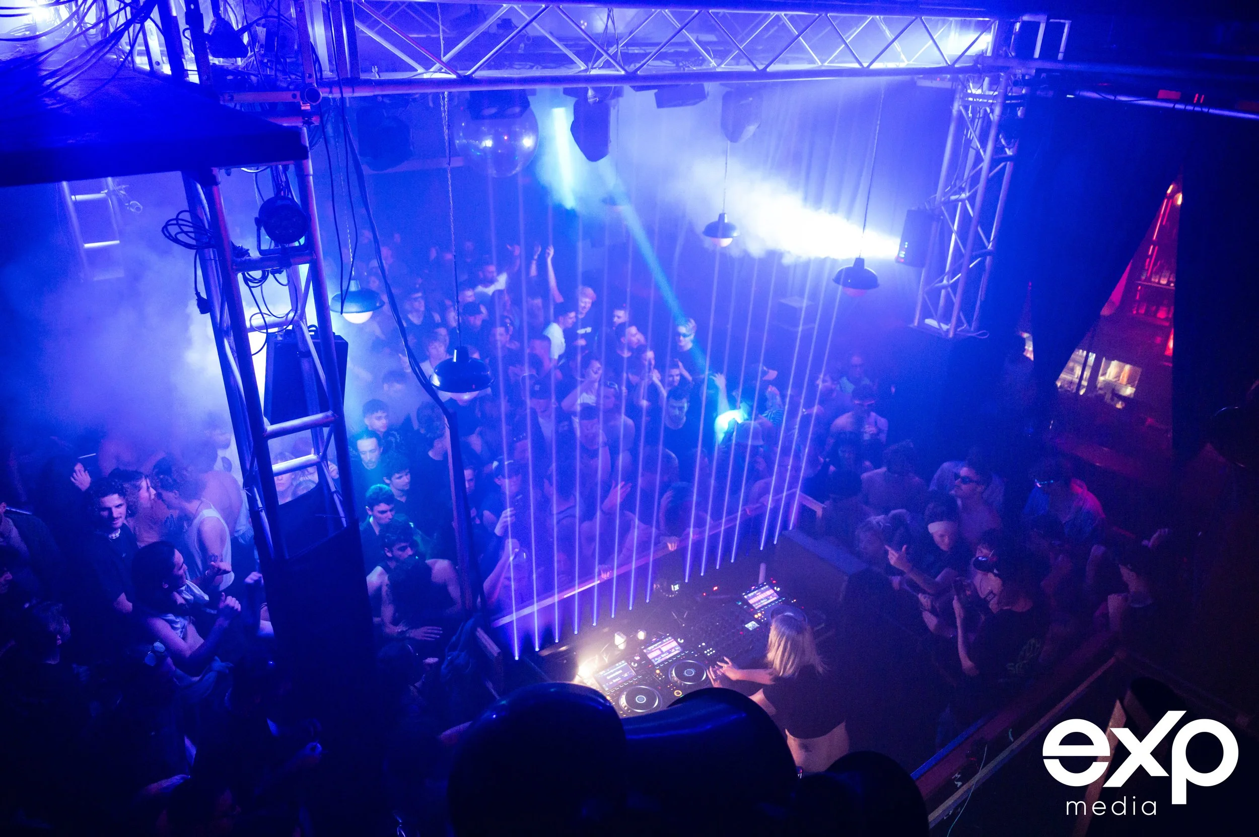 DJ performing at a crowded nightclub with vibrant blue and purple lighting and laser effects.