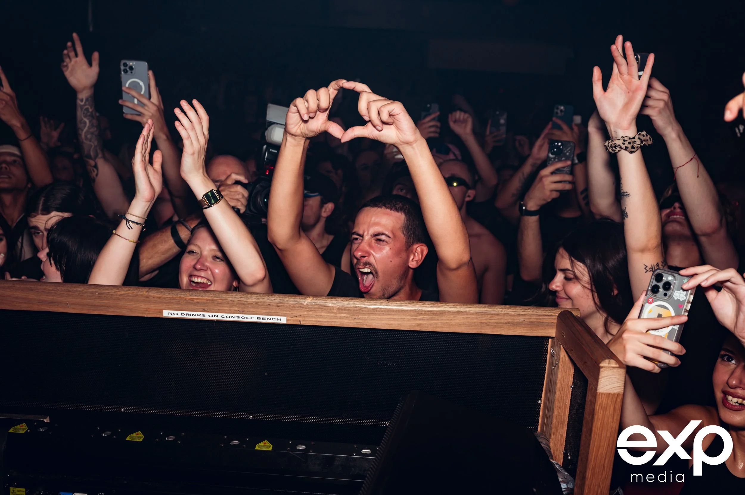 Concert crowd cheering with raised hands and phones.