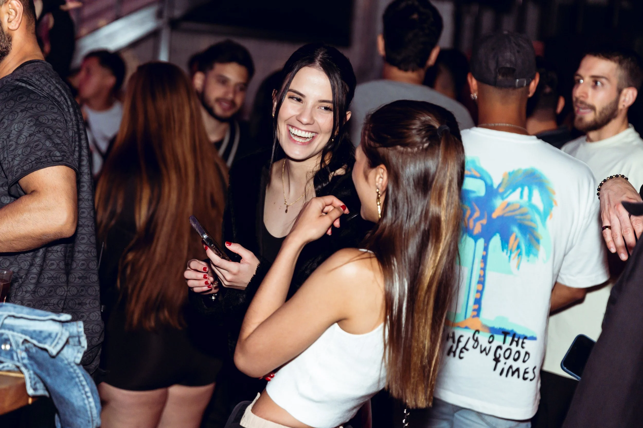 People socializing at a crowded party, two women are talking and smiling, one holding a phone; others engaged in conversation in the background.