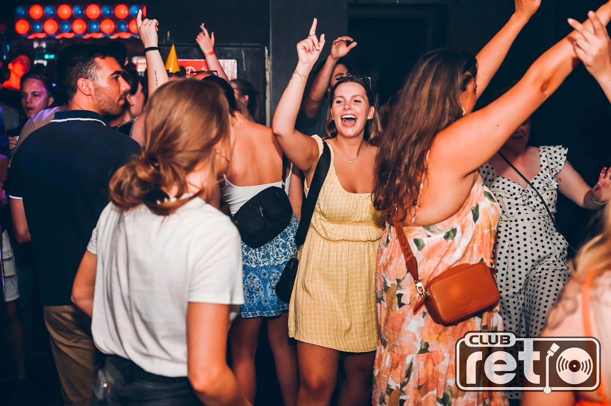 People dancing and enjoying themselves at a club event with vibrant lighting and a 'Club Retro' logo.