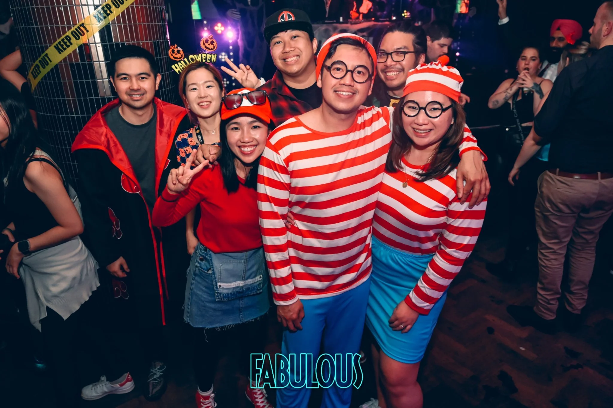 Group of people in costume at a Halloween party with a sign that says 'Fabulous'.
