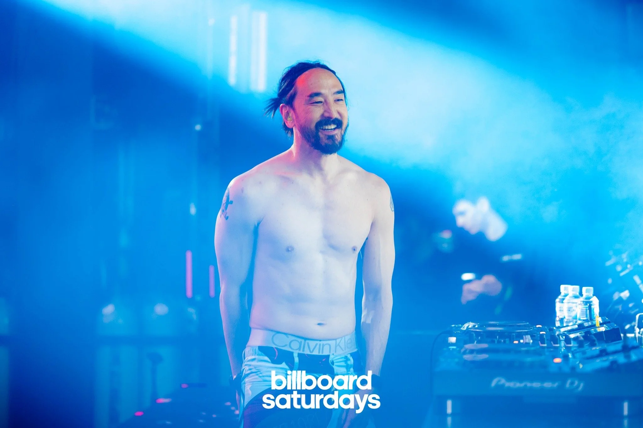 Man performing in a nightclub, shirtless, with DJ equipment and blue lighting, labeled 'Billboard Saturdays.'