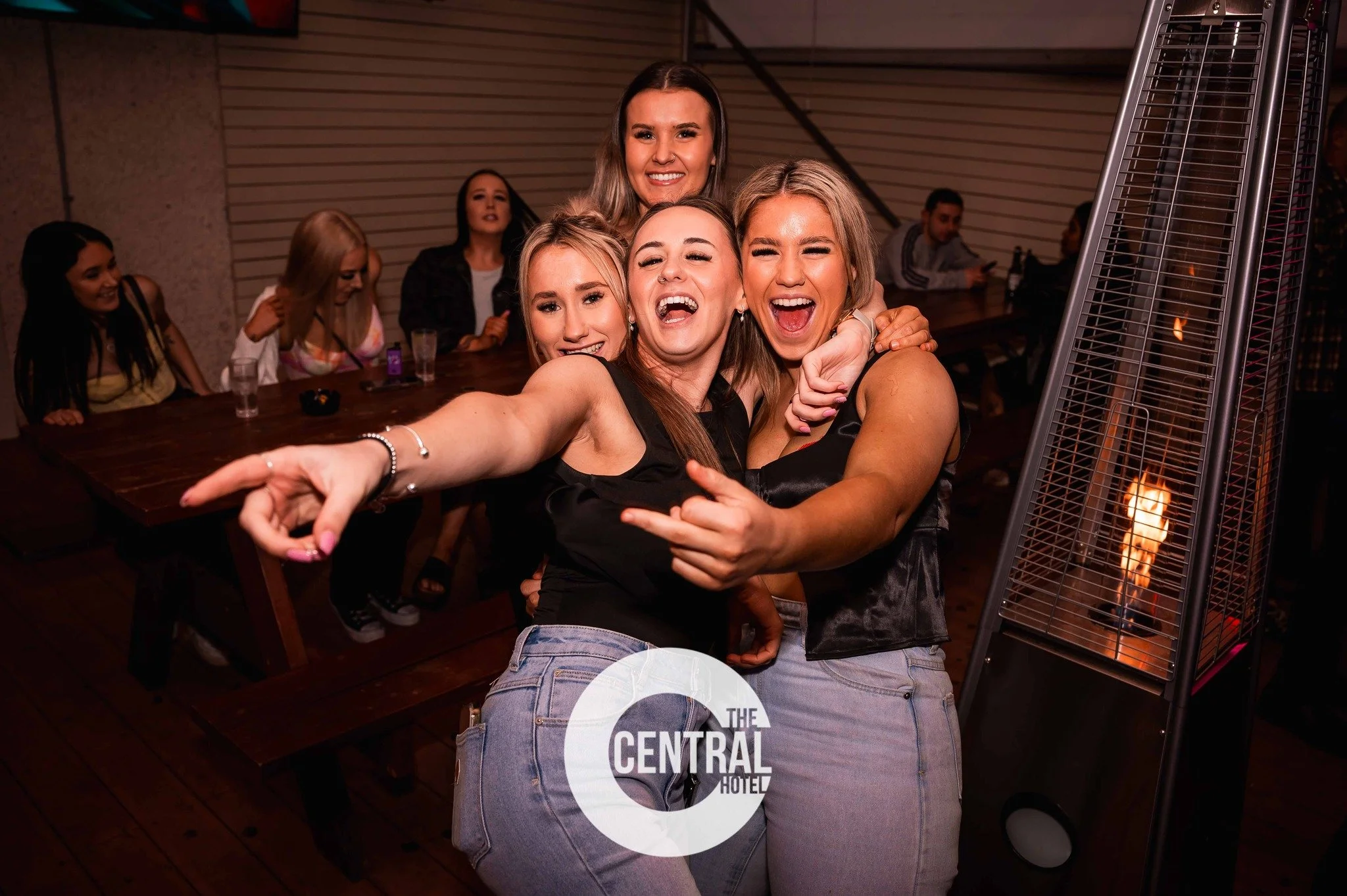 Group of friends enjoying a night out at The Central Hotel, laughing and posing for a photo indoors near a patio heater.