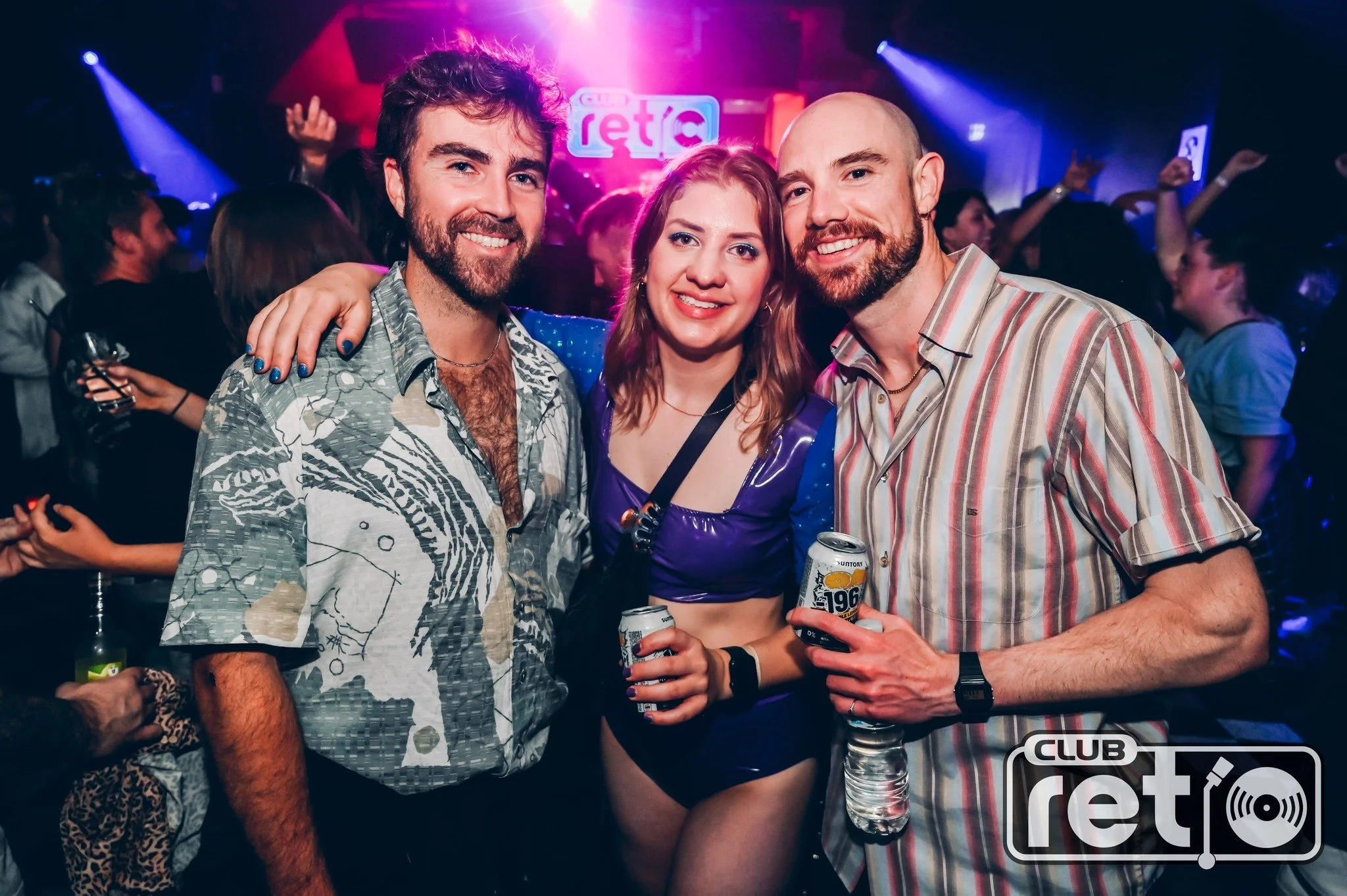 Three people enjoying a night out at Club Retro, posing for a photo. Two men and one woman are smiling, holding drinks, with a lively crowd and colorful lights in the background.