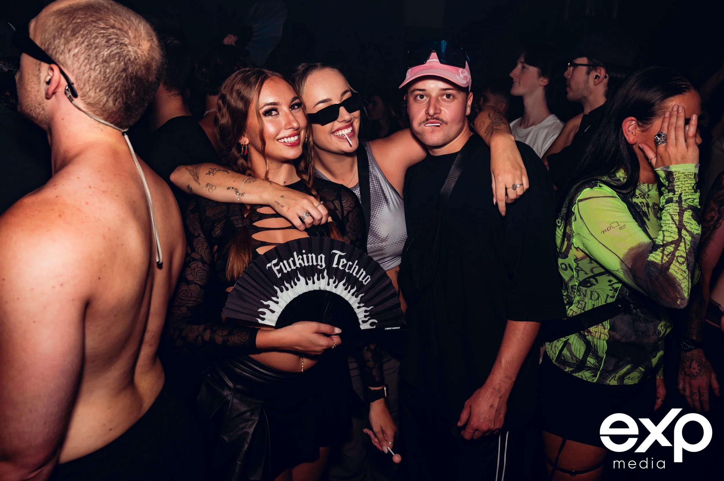 Group of people enjoying a night out at a club, one person holding a fan with "Fucking Techno" text, wearing trendy outfits.
