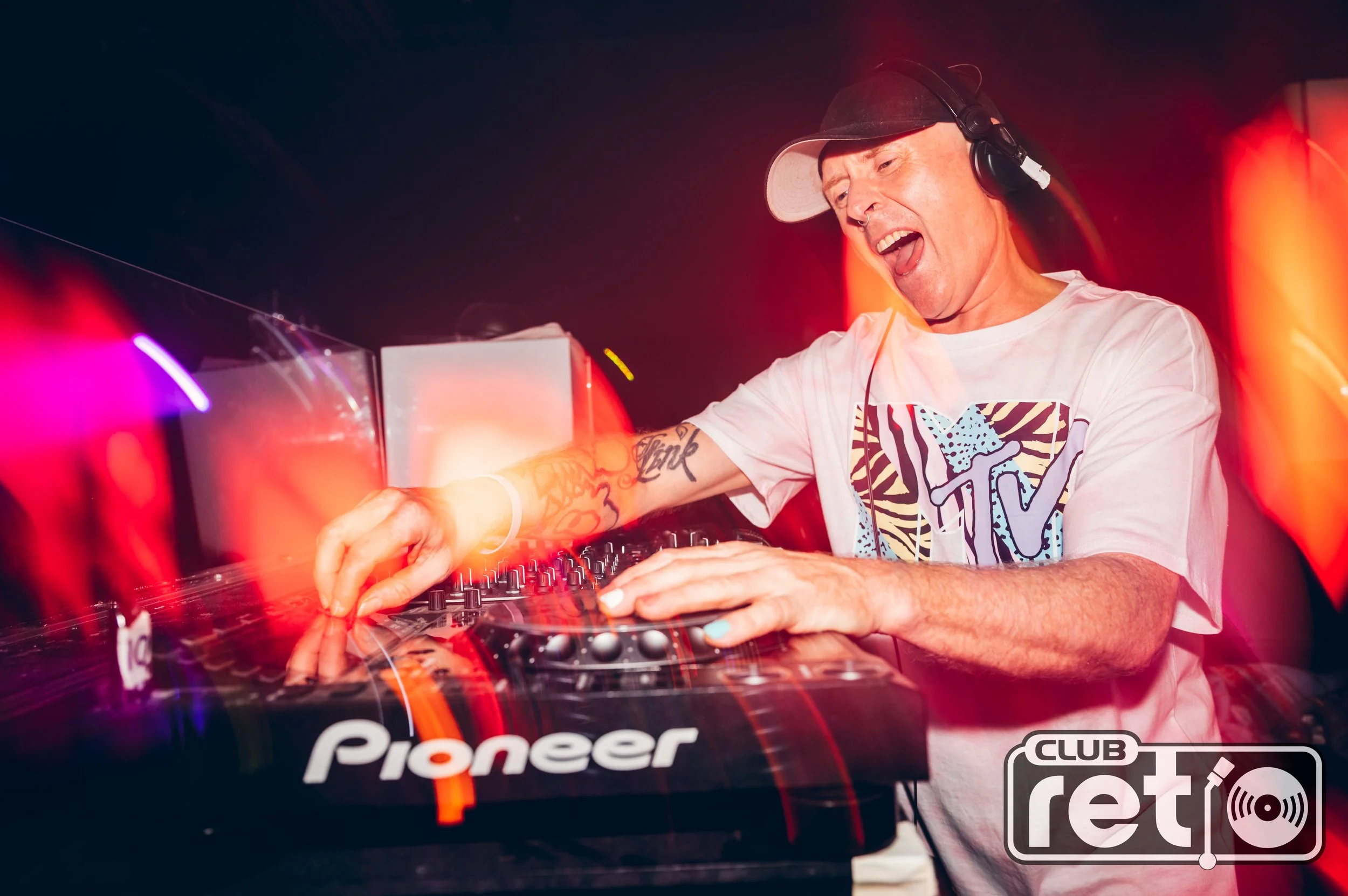 DJ performing at Club Retro, wearing a white graphic t-shirt and cap, using a Pioneer DJ controller with colorful lights.