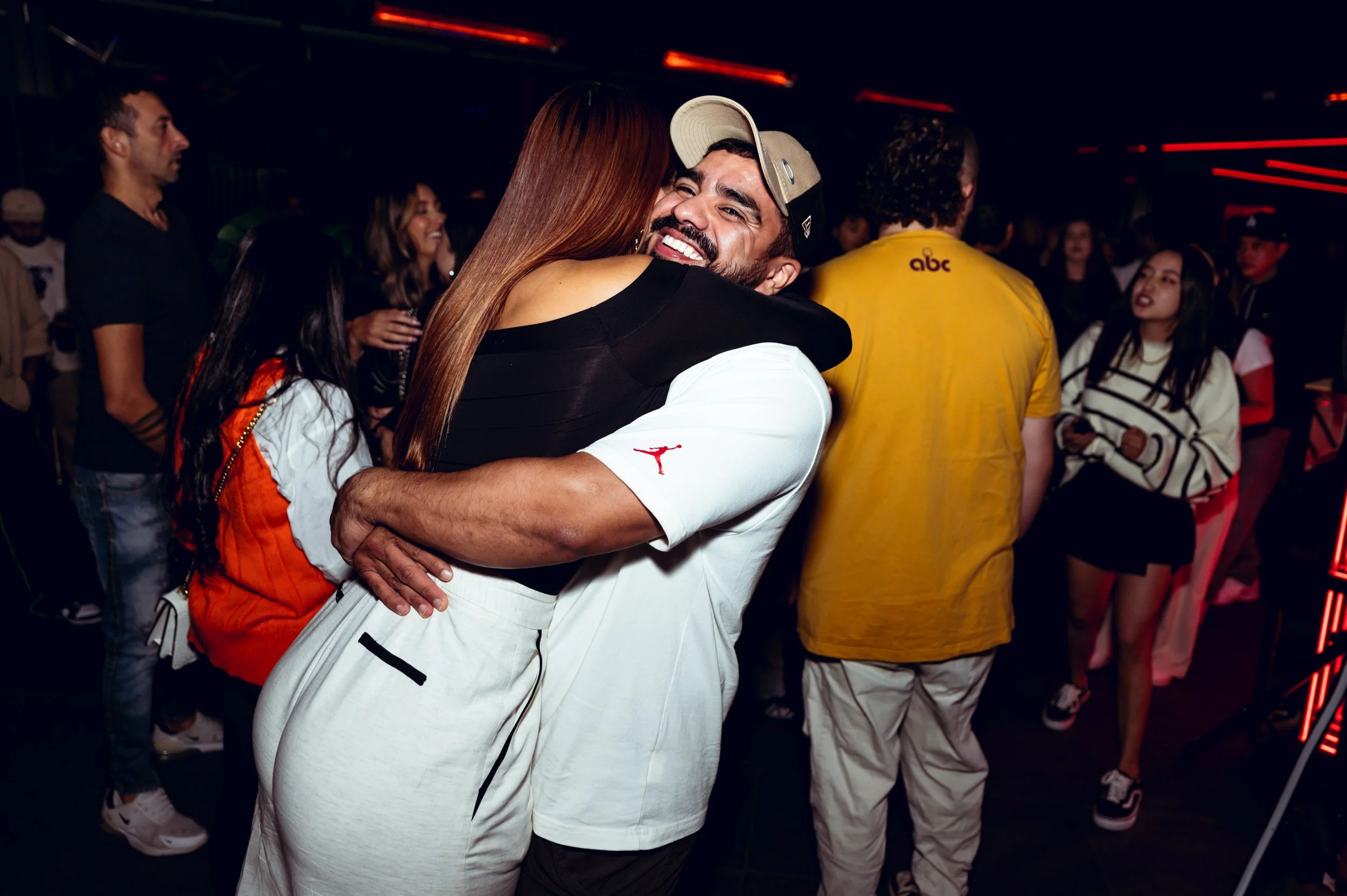 People hugging at a lively party with neon lights.