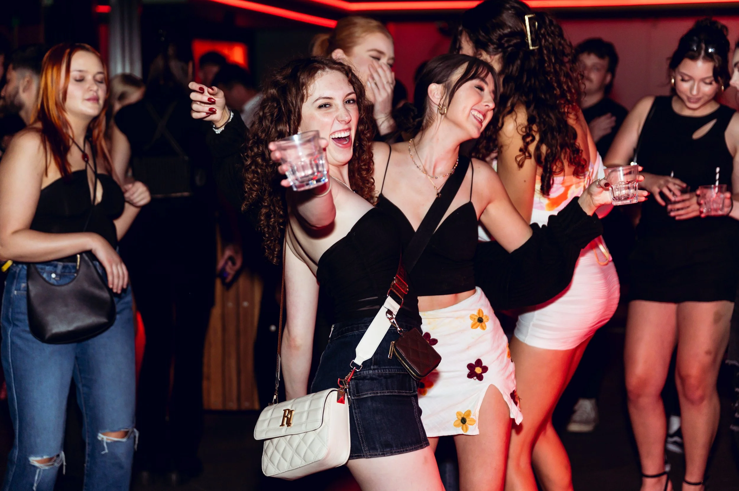 Group of young women dancing and holding drinks in a nightclub with red lighting.