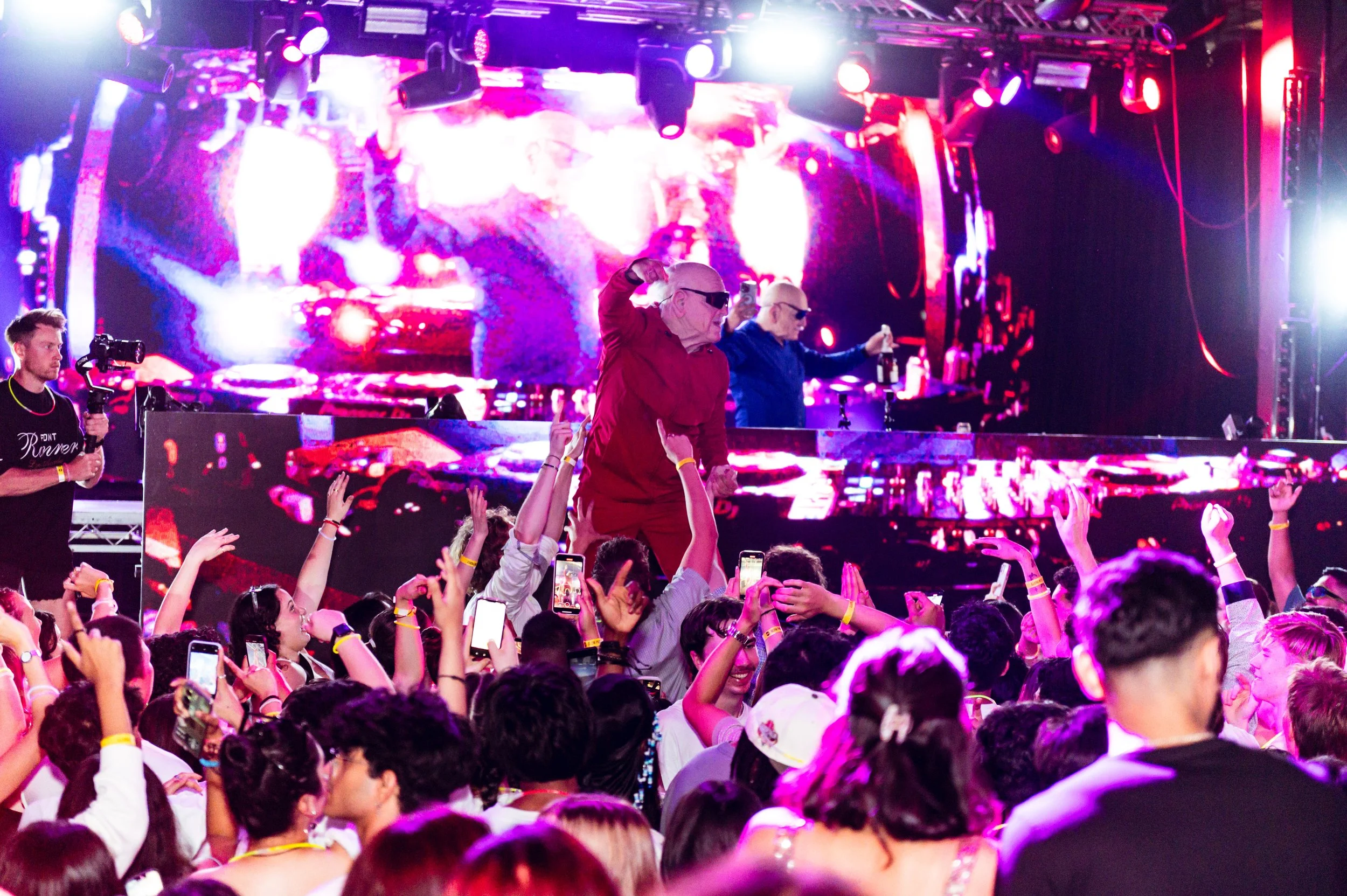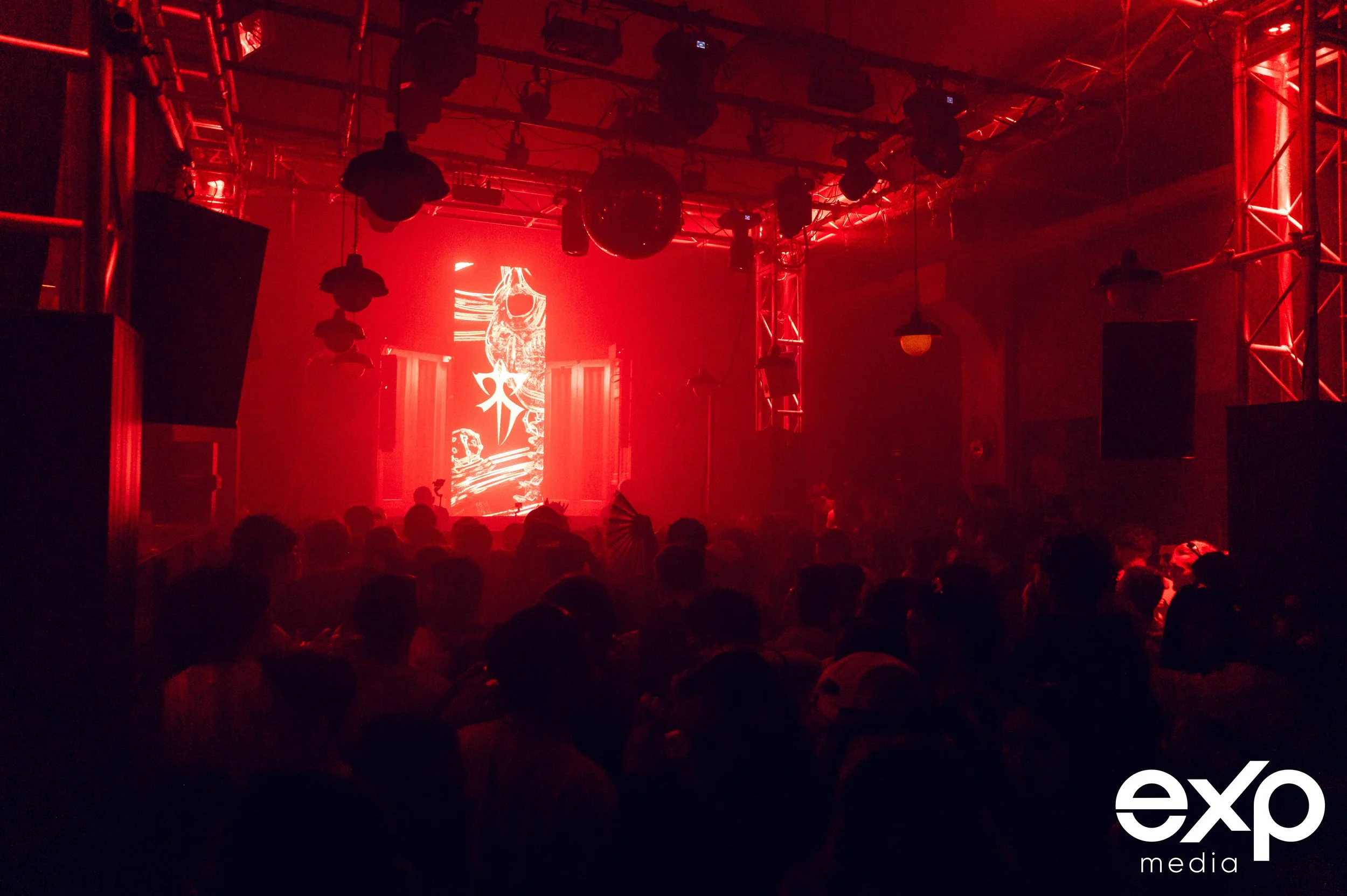 Nightclub scene with red lighting, large crowd, and electronic screen on stage.