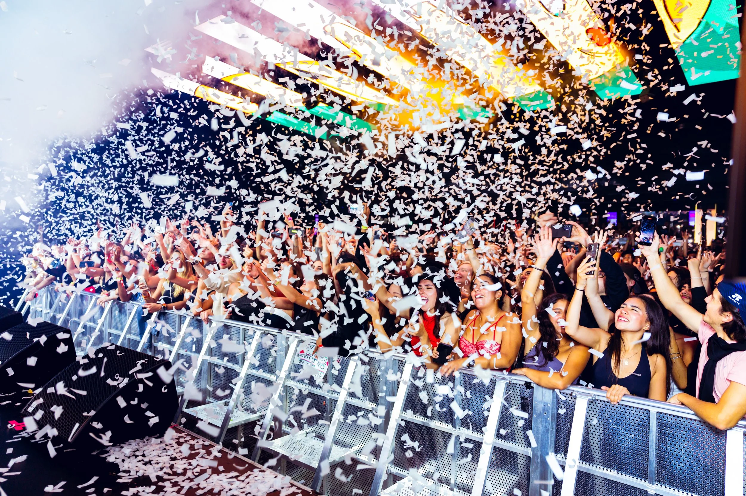 Crowd at a concert with confetti falling, people cheering and taking photos.