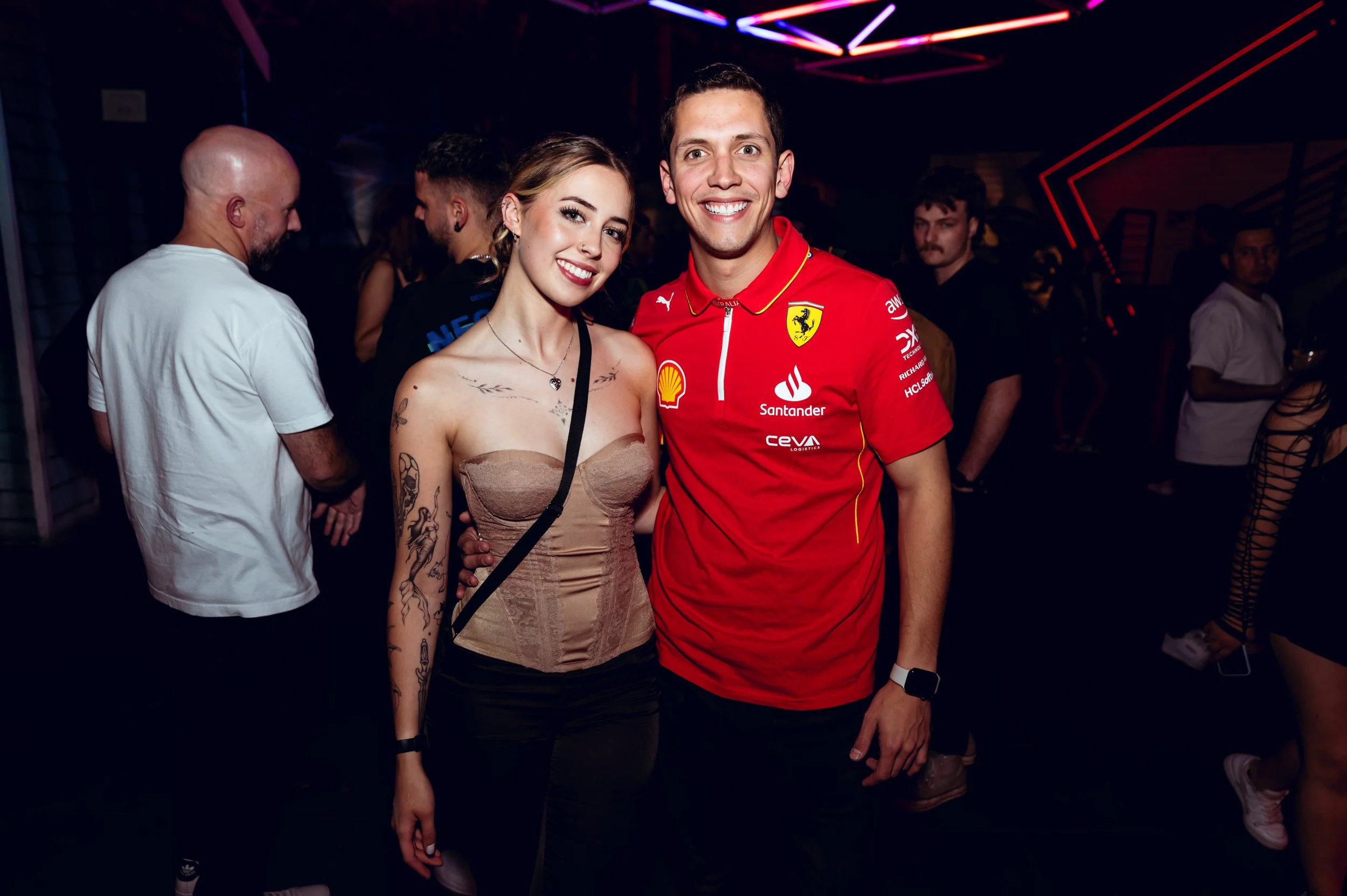 A man and woman smiling at a party, with the man wearing a Ferrari shirt and the woman displaying tattoos on her arm. Other people are visible in the background.