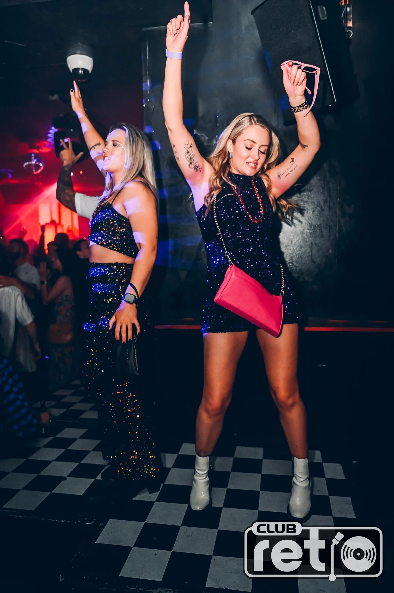Two women dancing in a nightclub wearing sparkly outfits and raising their arms, with a checkered floor and "Club Retro" logo visible.