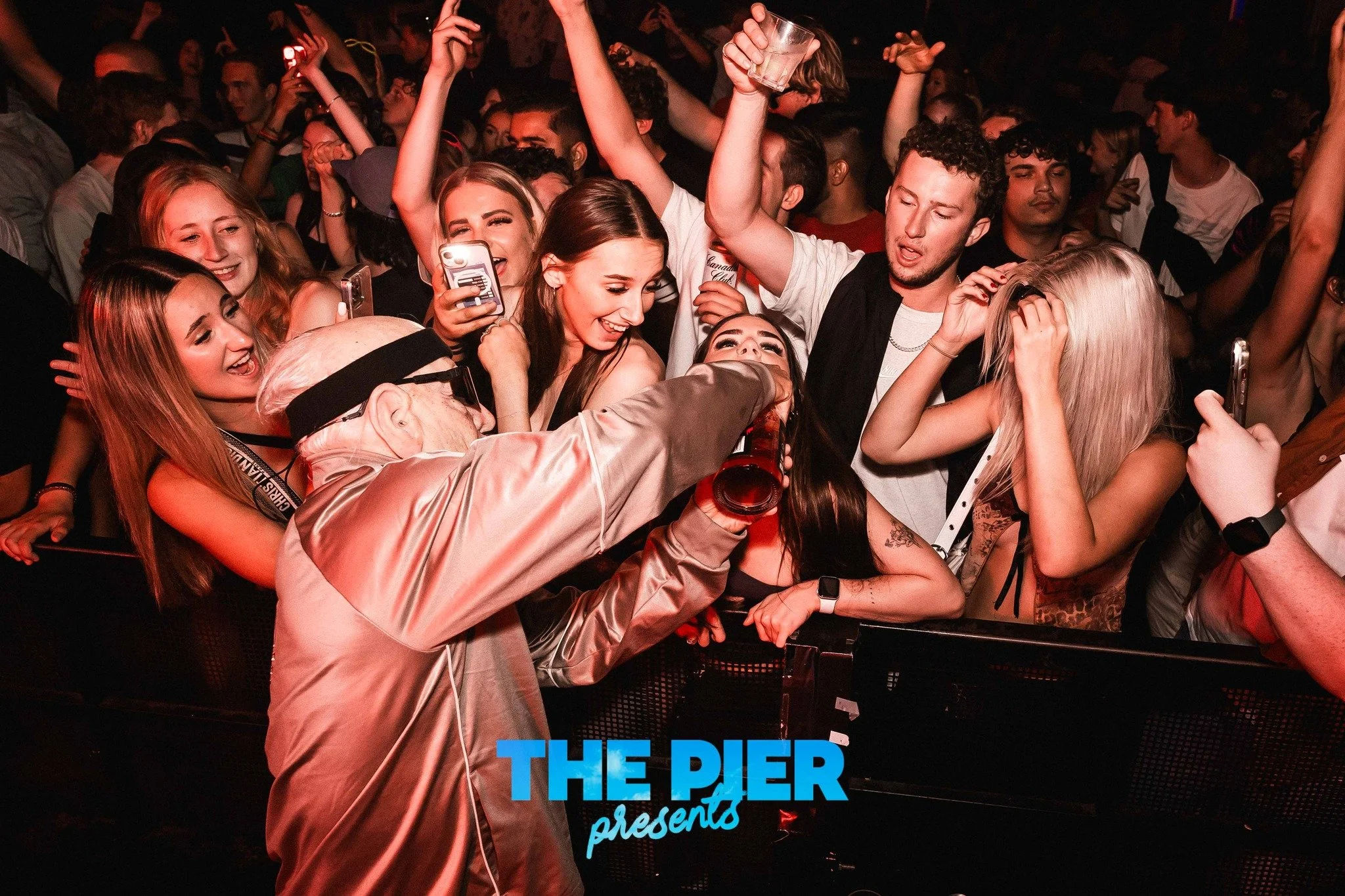 Four women wearing headphones and stylish outfits at a nightclub event, with "The Pier presents" text at the bottom.