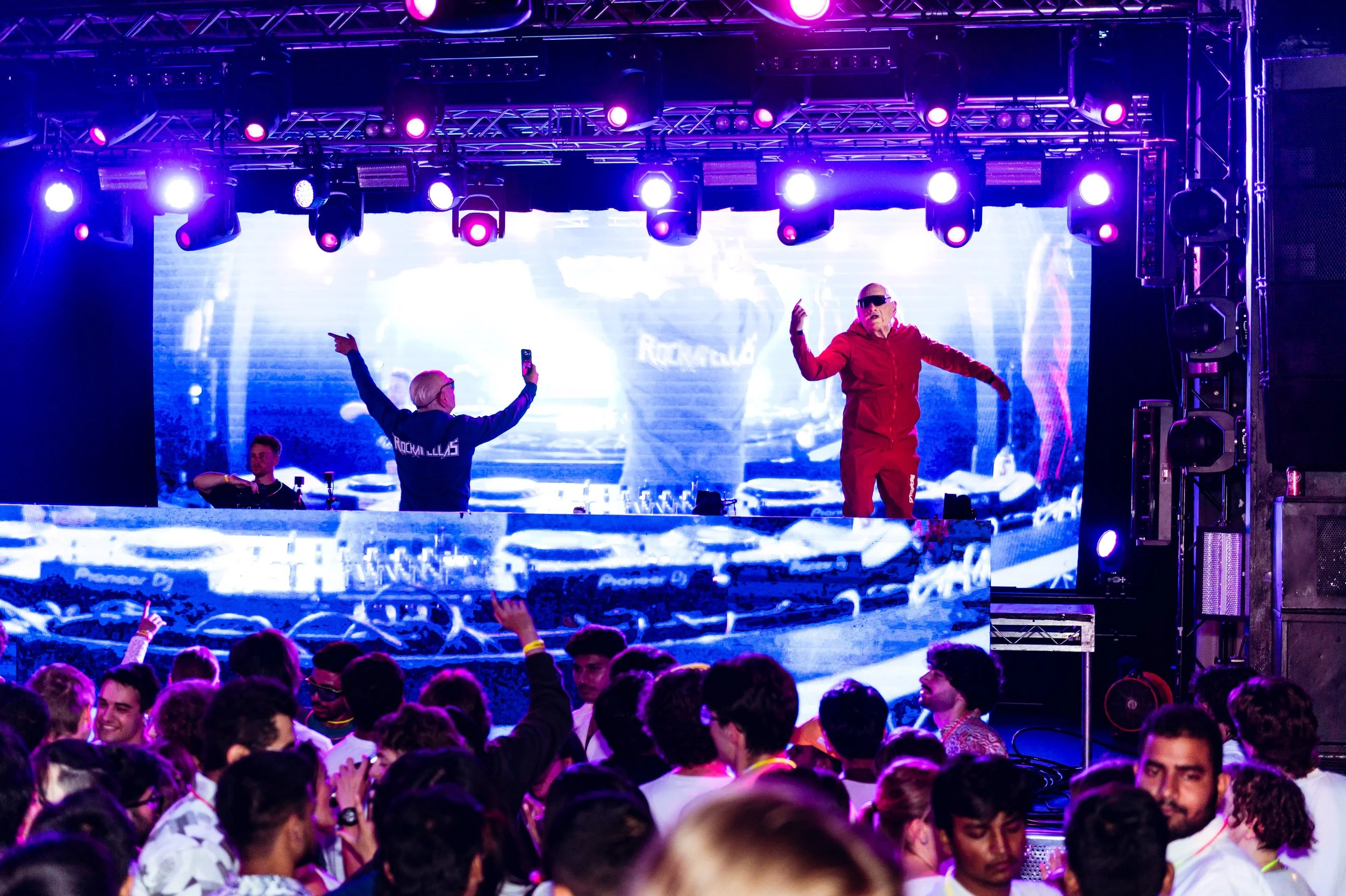 Two women DJs performing in a nightclub with hands raised, standing behind DJ equipment with a large screen behind them displaying an image of a woman.