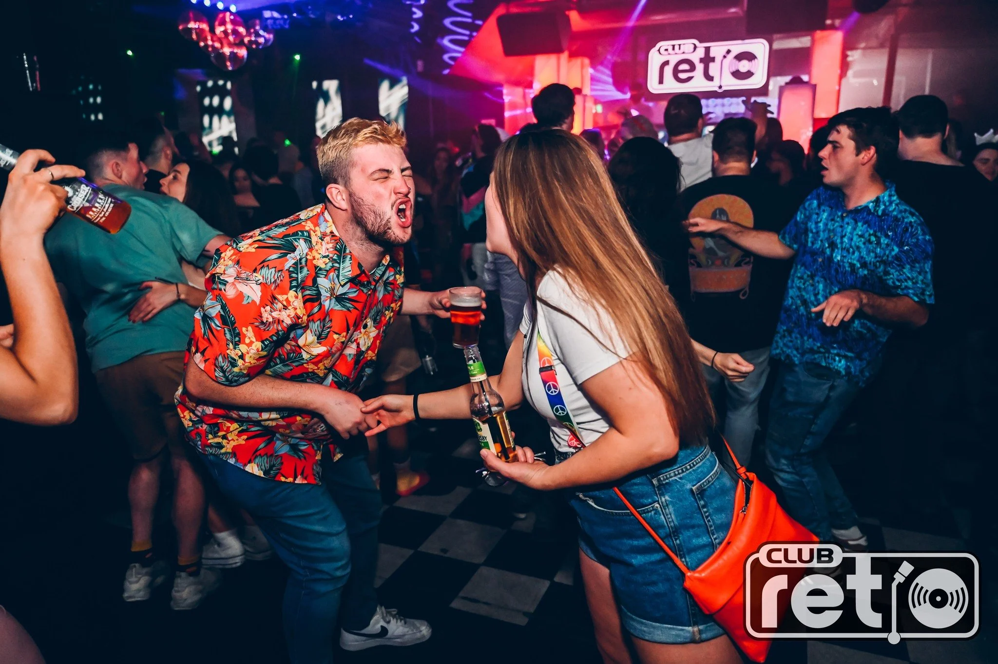 People dancing and holding drinks in a nightclub with colorful lights and a logo for Club Retro.