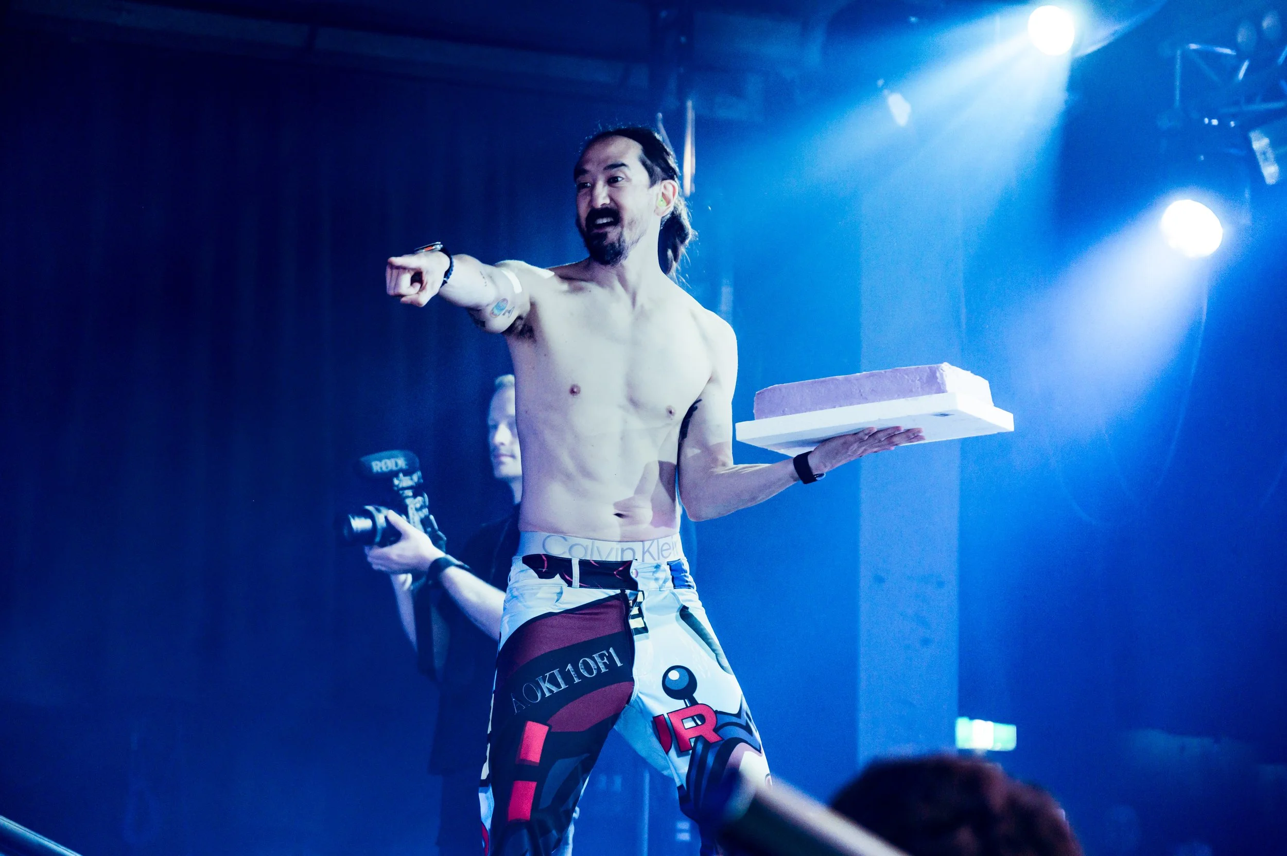 Shirtless man holding a cake at a concert stage with a photographer in the background.