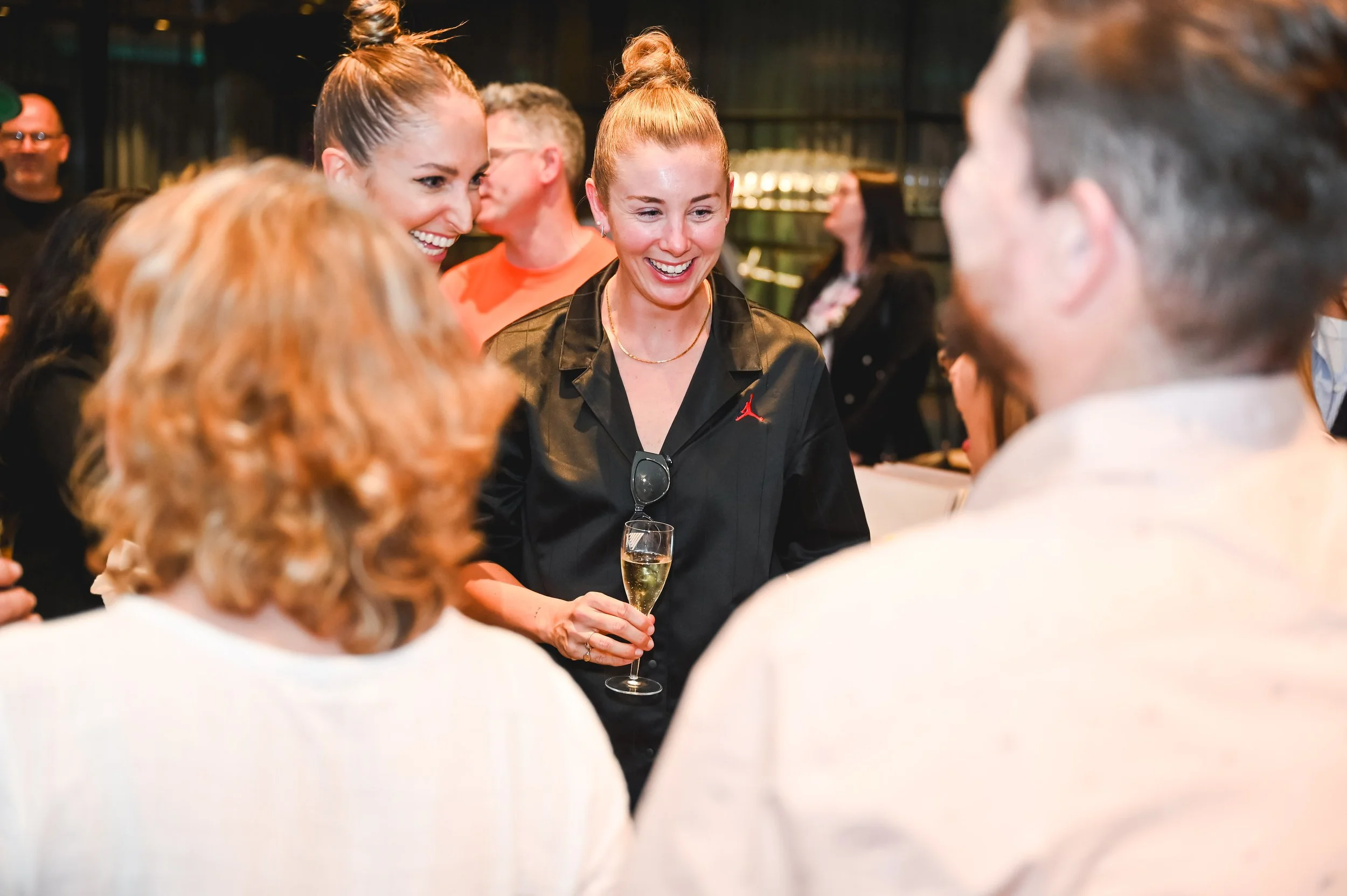 Group of people seated at a social event, chatting and smiling, with drinks on the table.