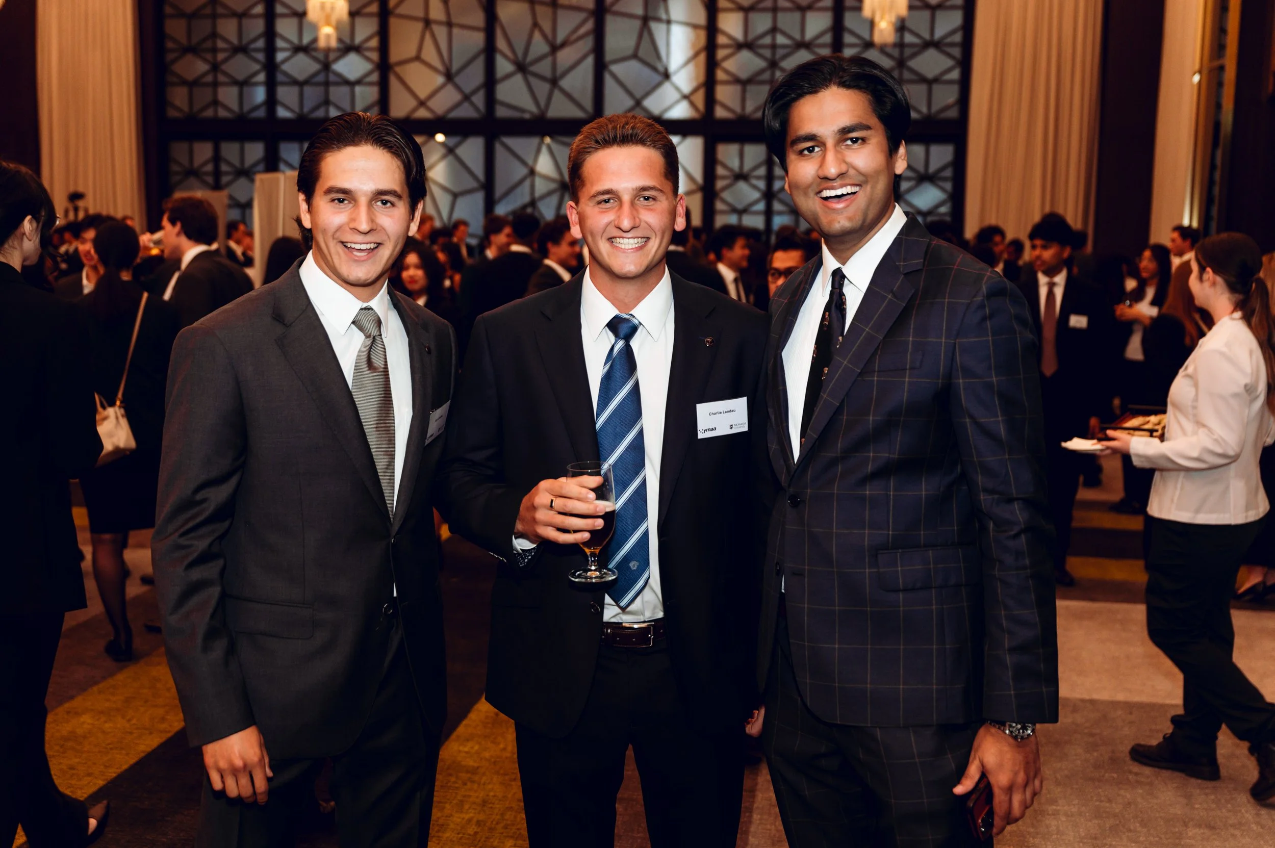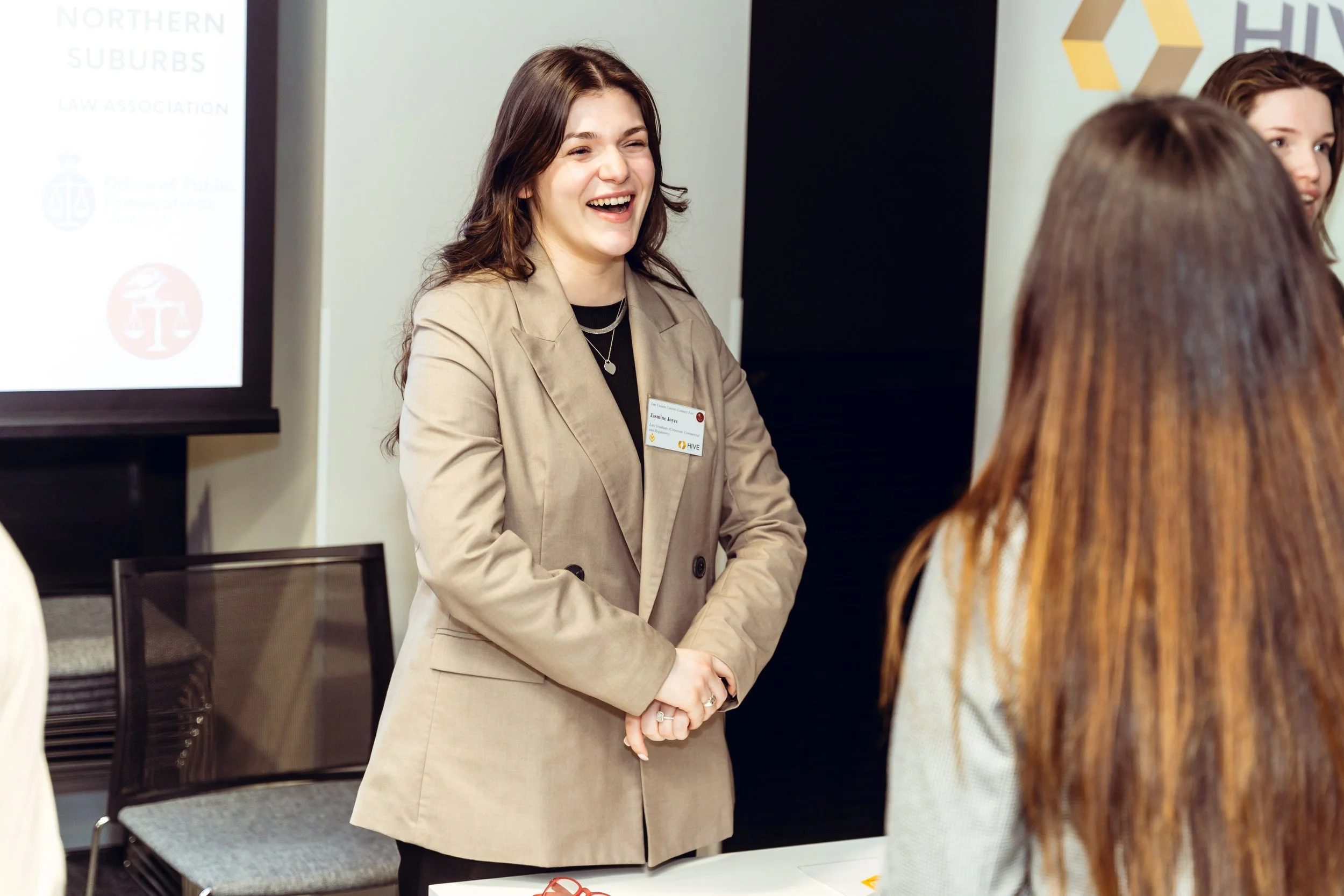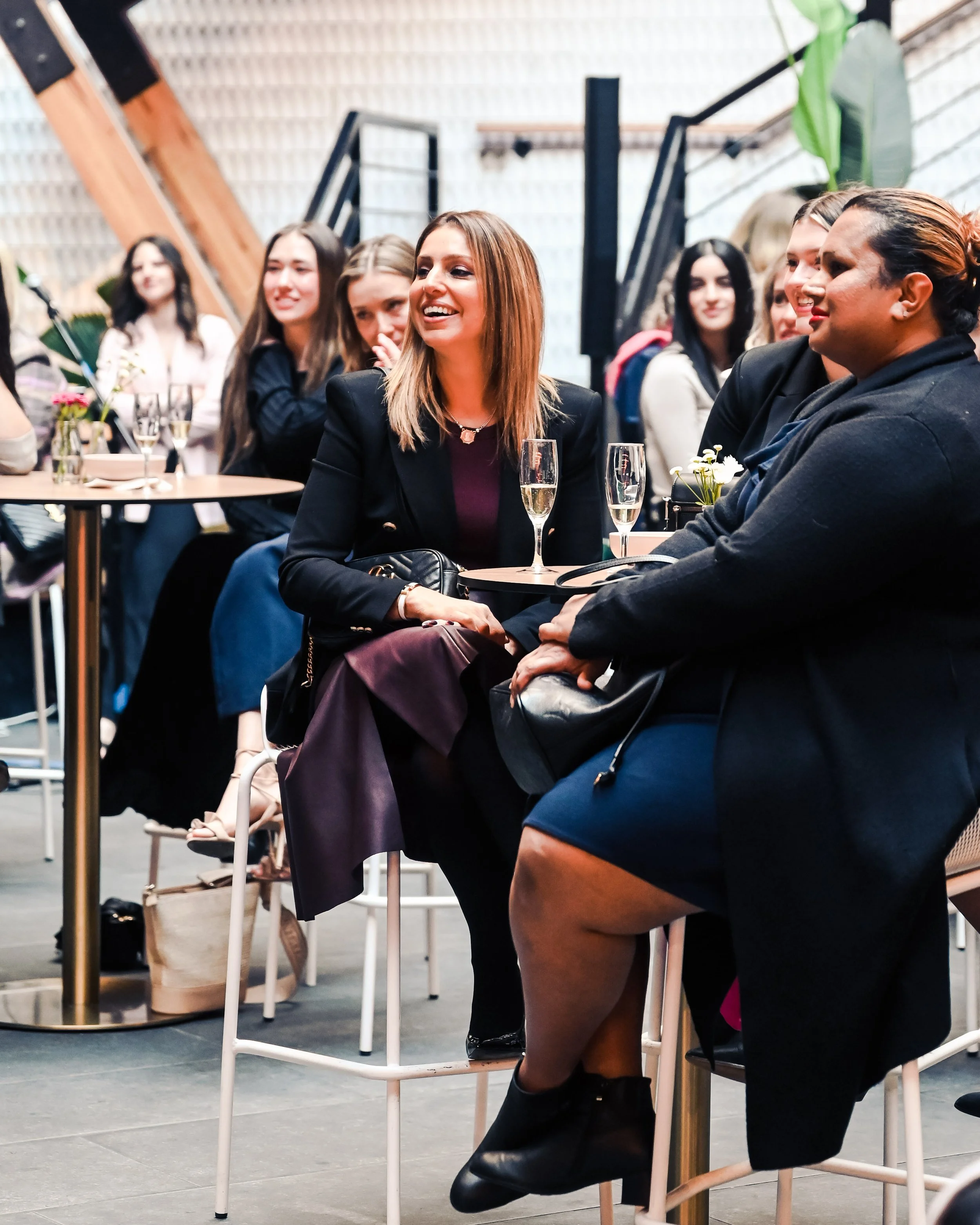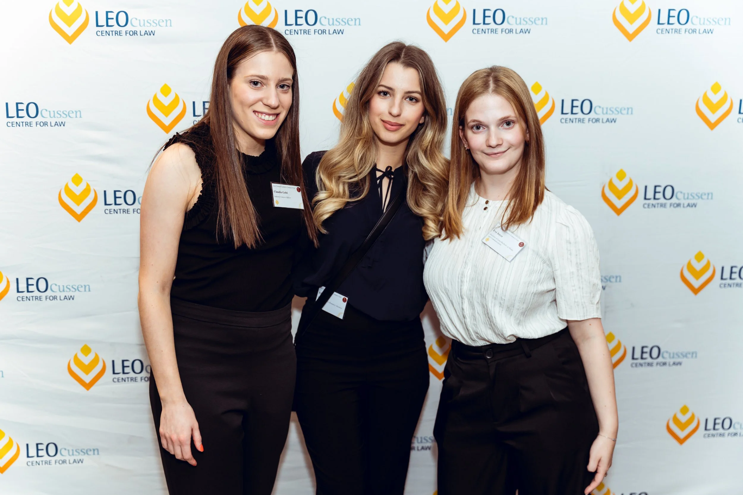 Three women posing at a Leo Cussen Centre for Law event, smiling in front of a branded backdrop.