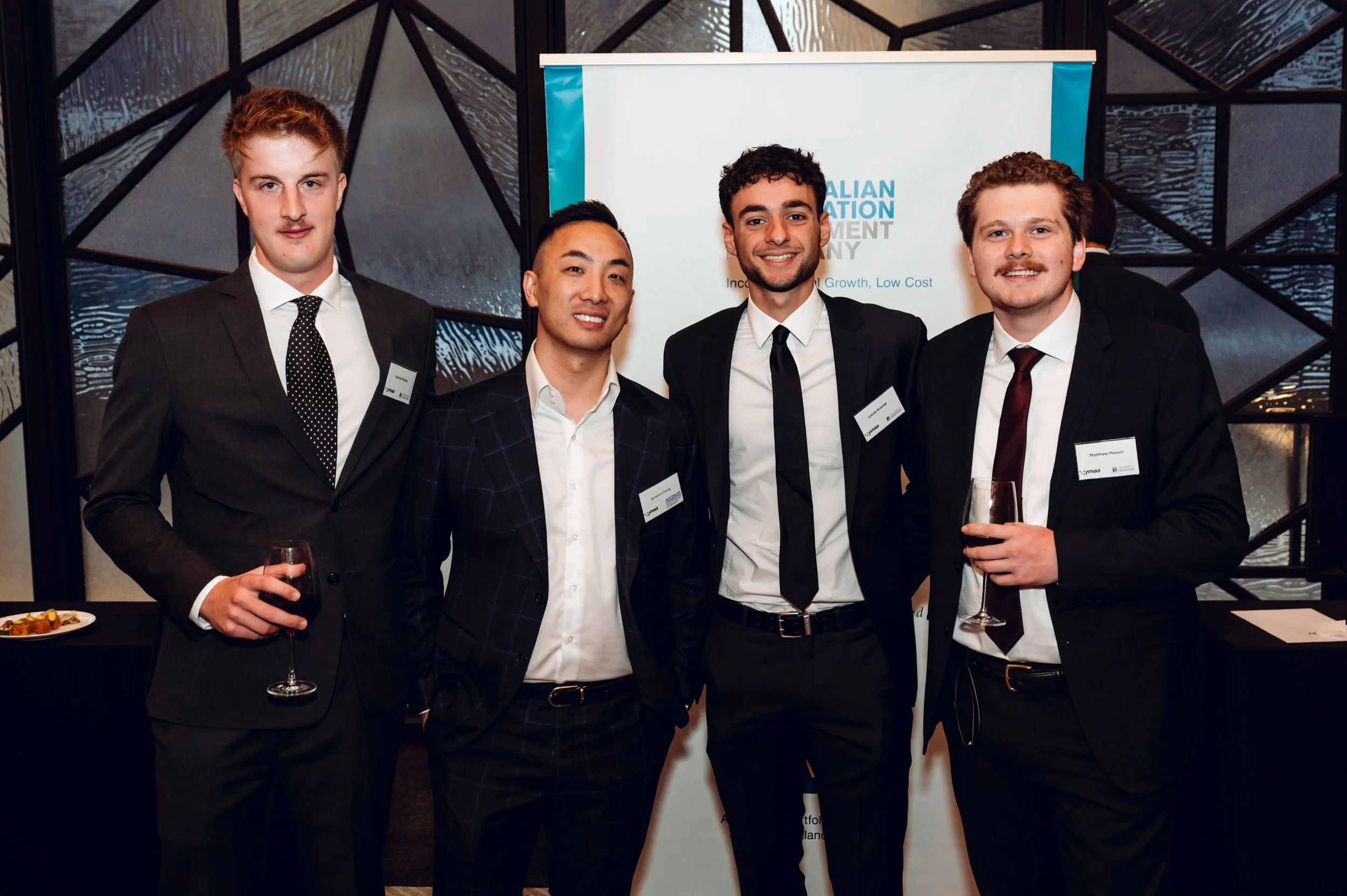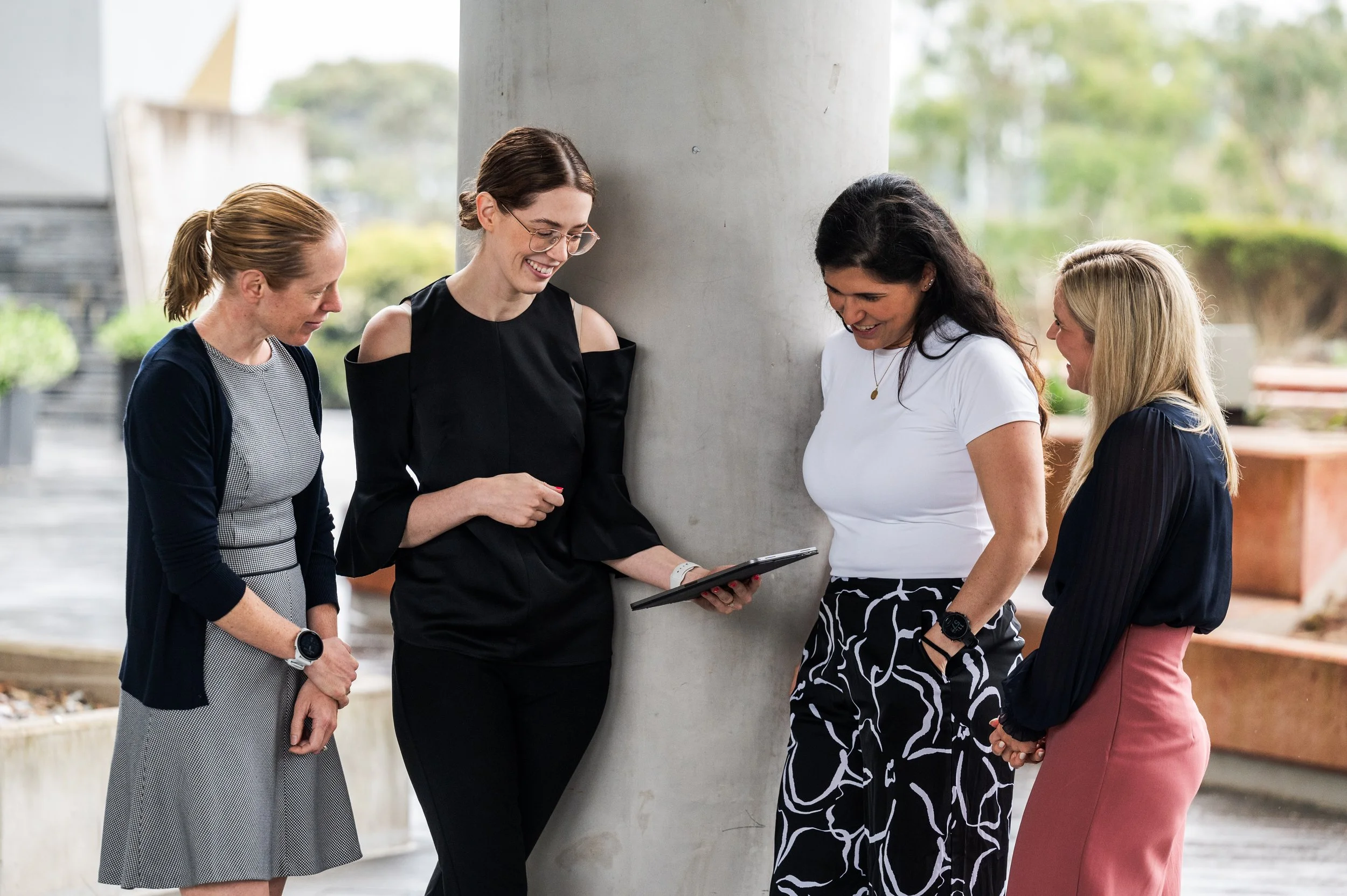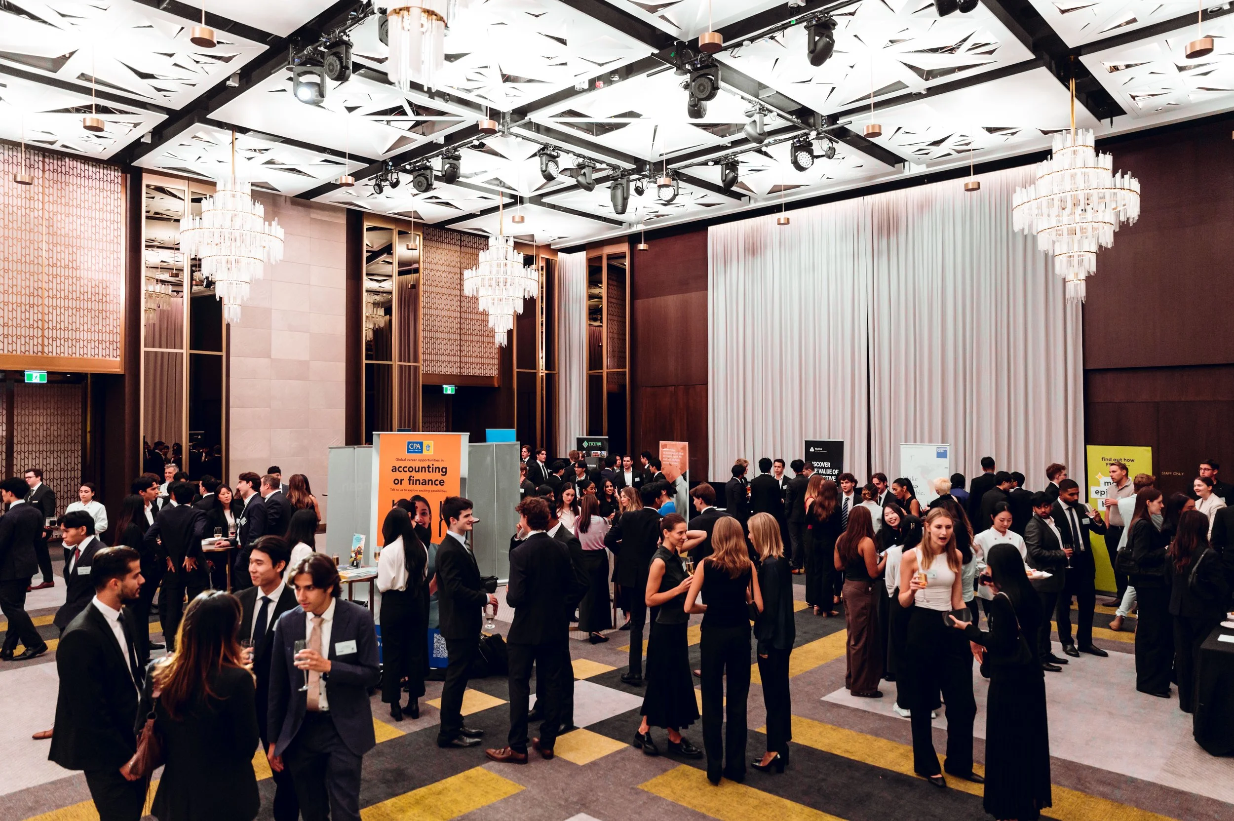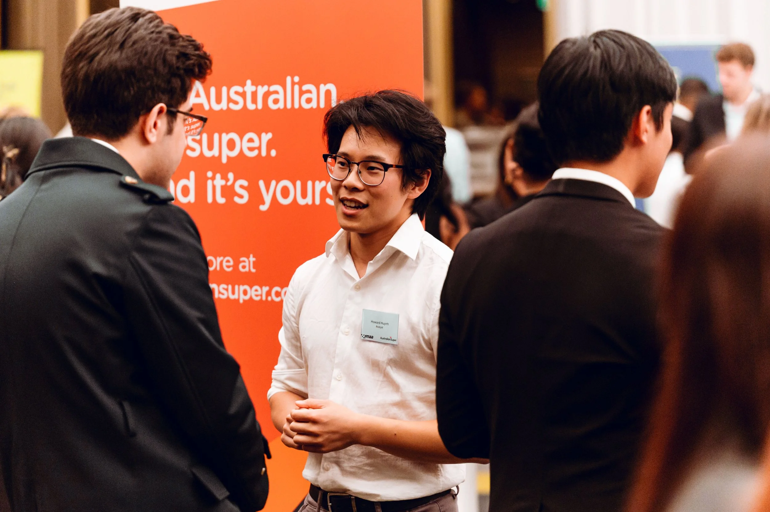 Three women posing at a Leo Cussen Centre for Law event, smiling in front of a branded backdrop.