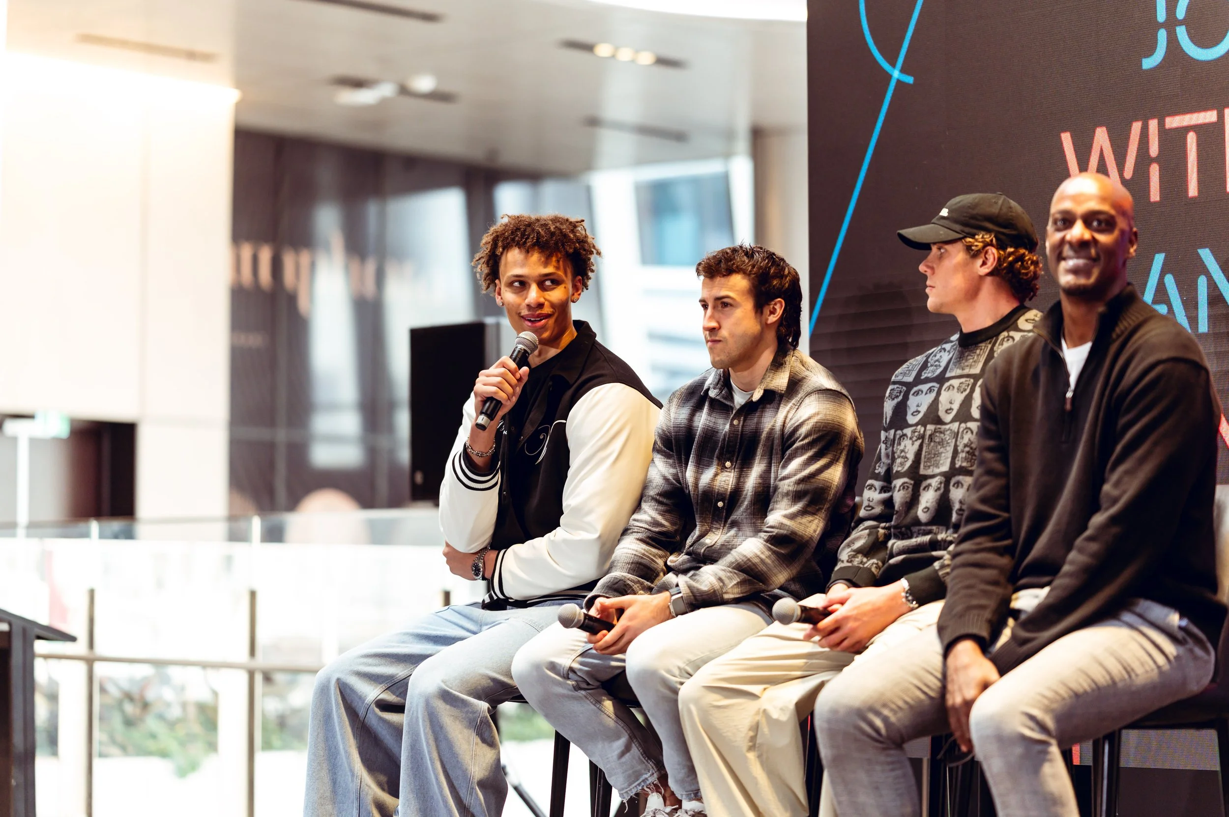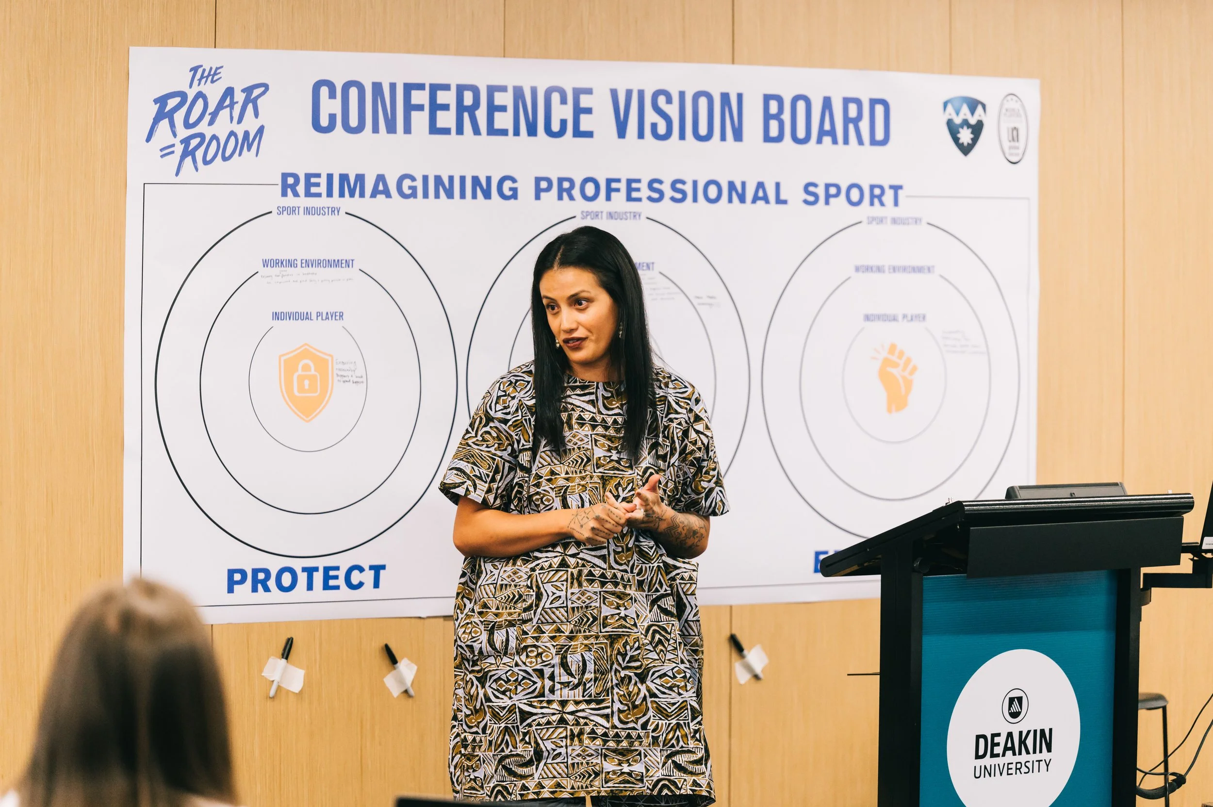 A person standing in front of a conference vision board labeled "Reimagining Professional Sport" at Deakin University, emphasizing a protective strategy for individual players within the sport industry.