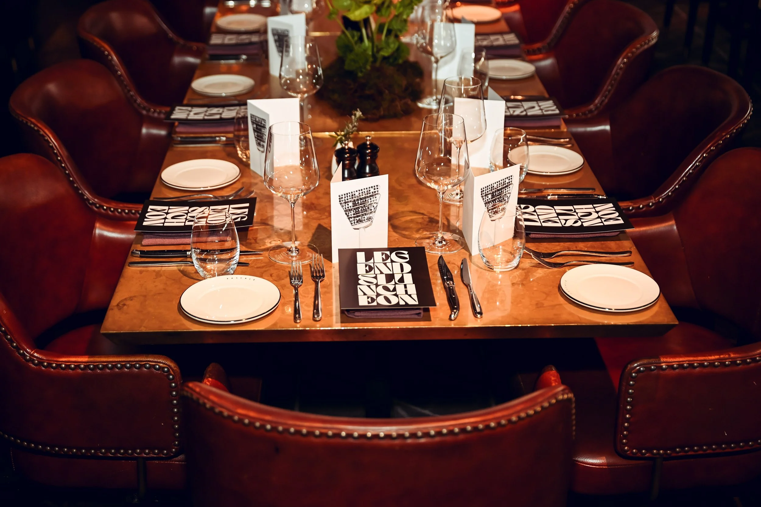 Elegant dining table setting with brown leather chairs, white plates, glasses, menus, and silverware arranged on a wooden table.