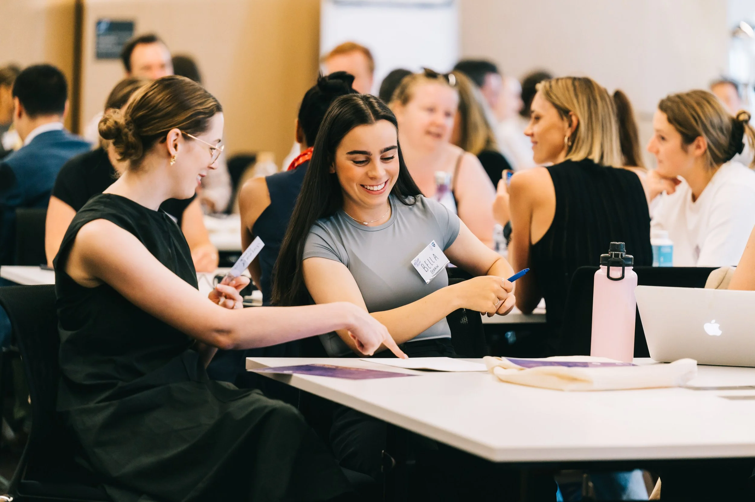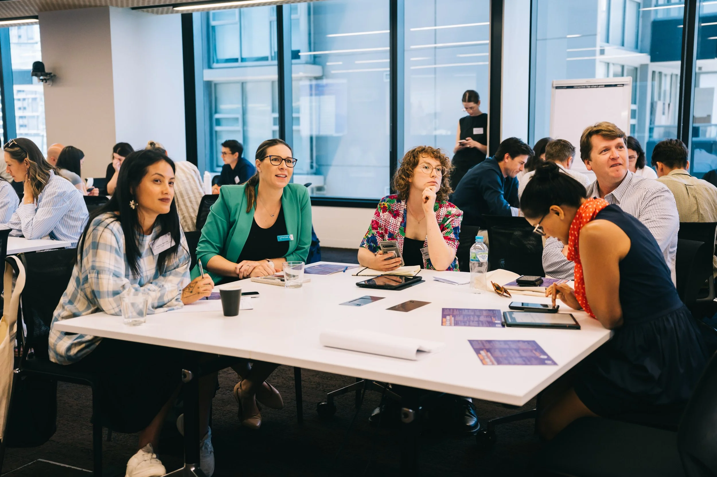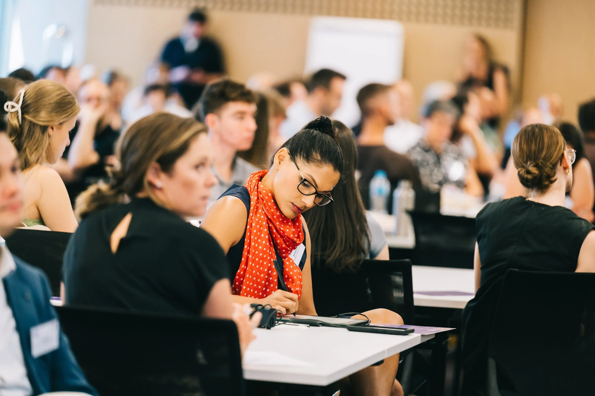 People attending a conference, seated at tables, focusing and writing notes, with a woman in a red scarf prominent.