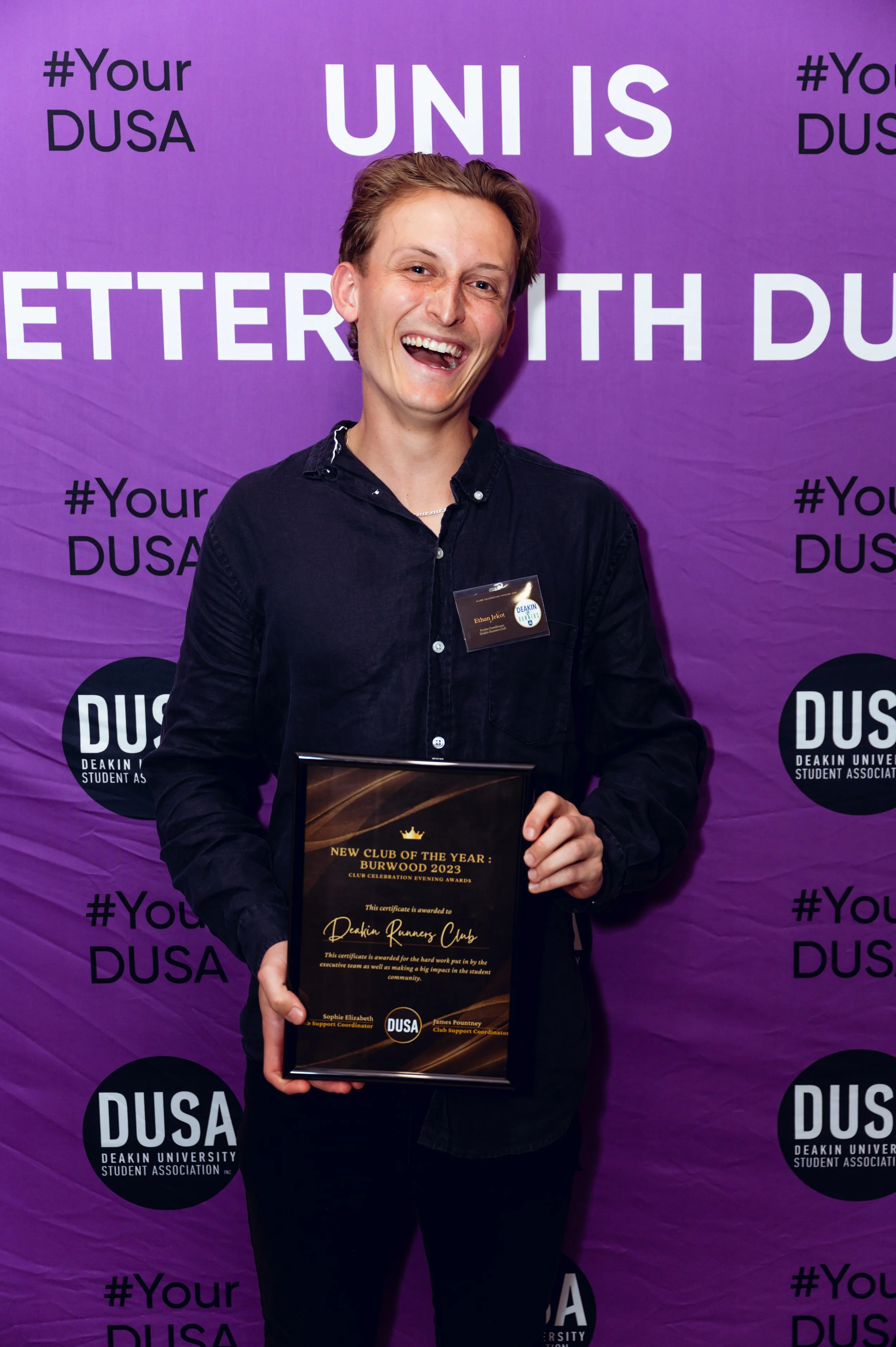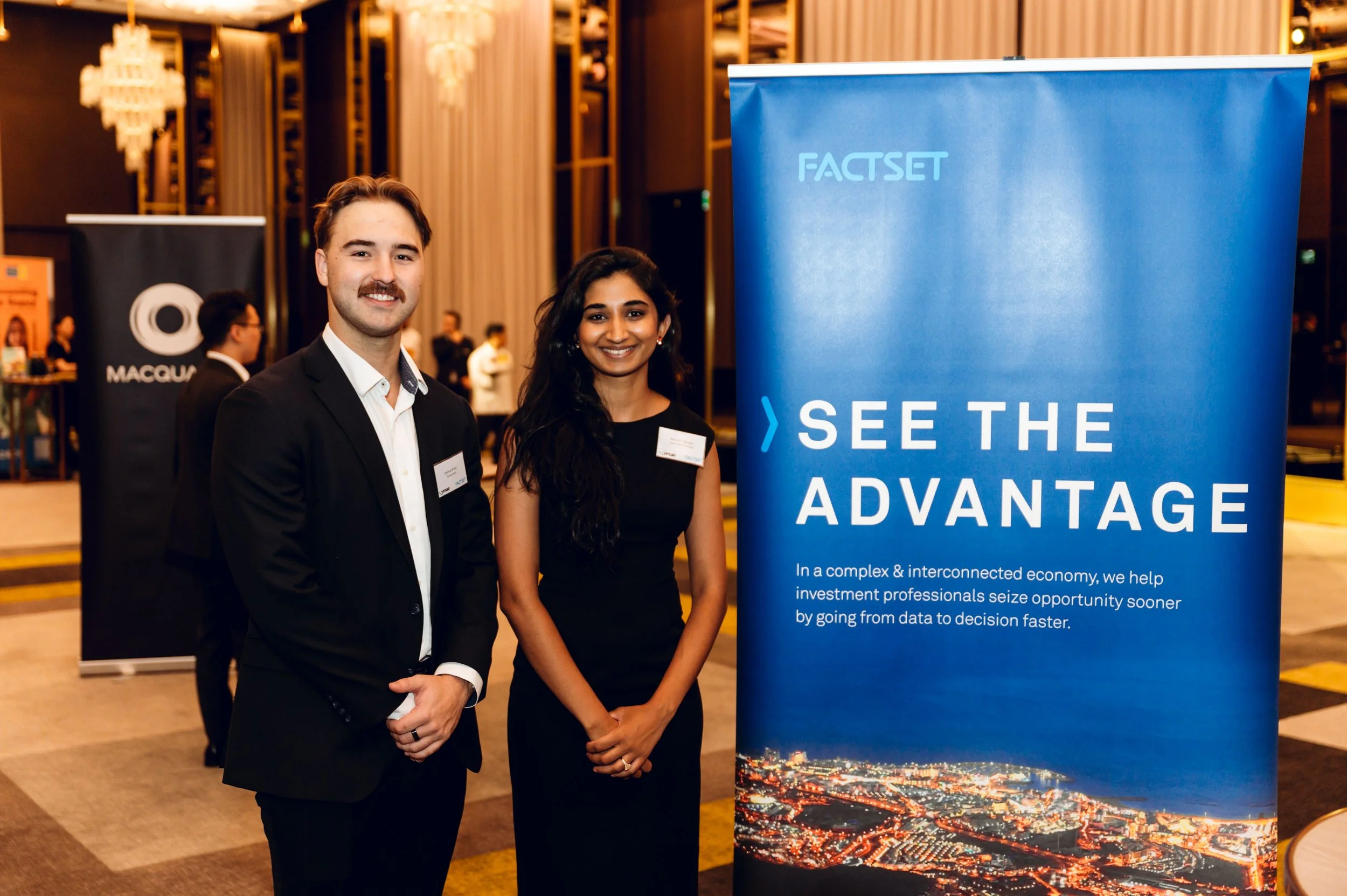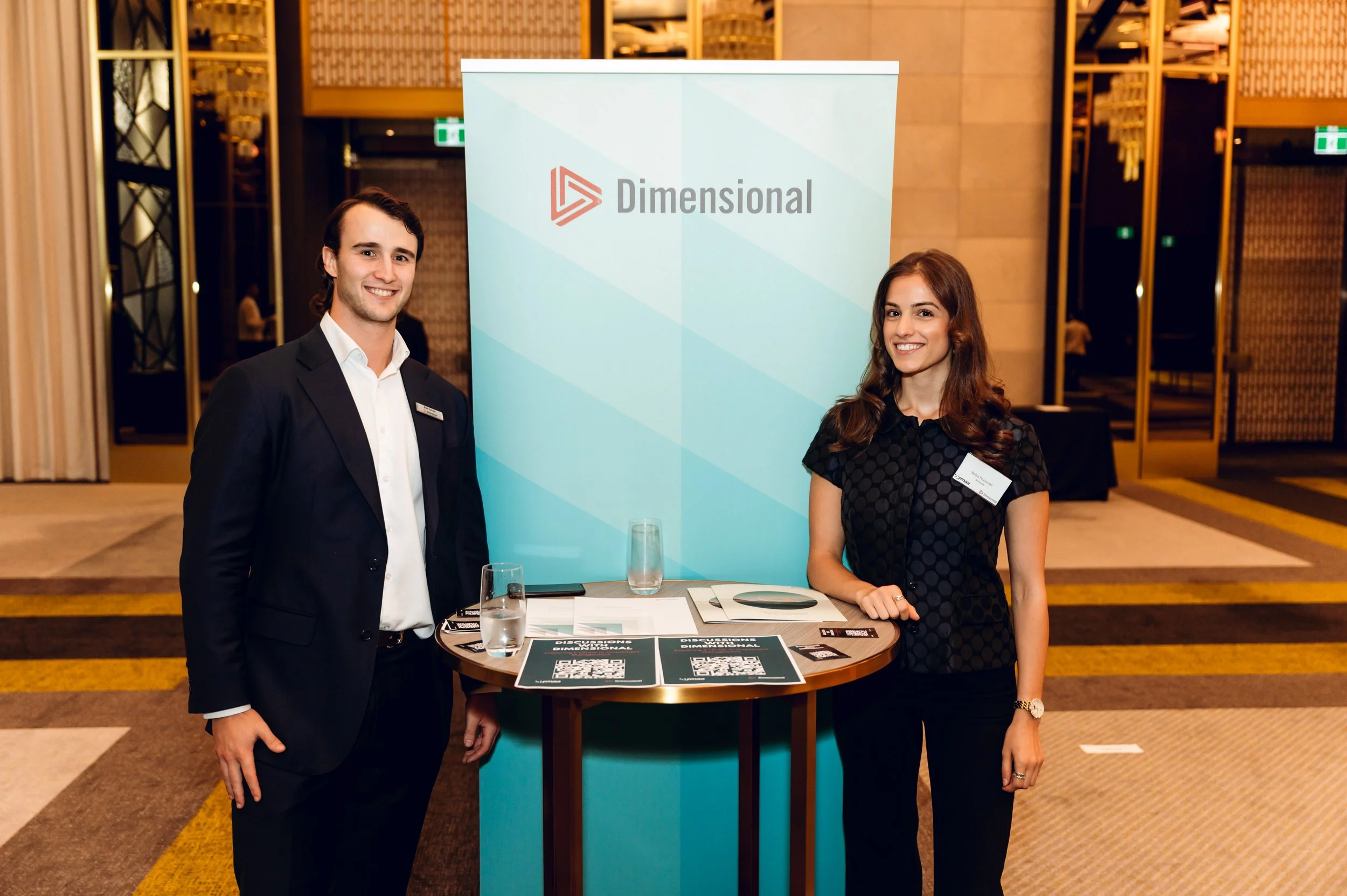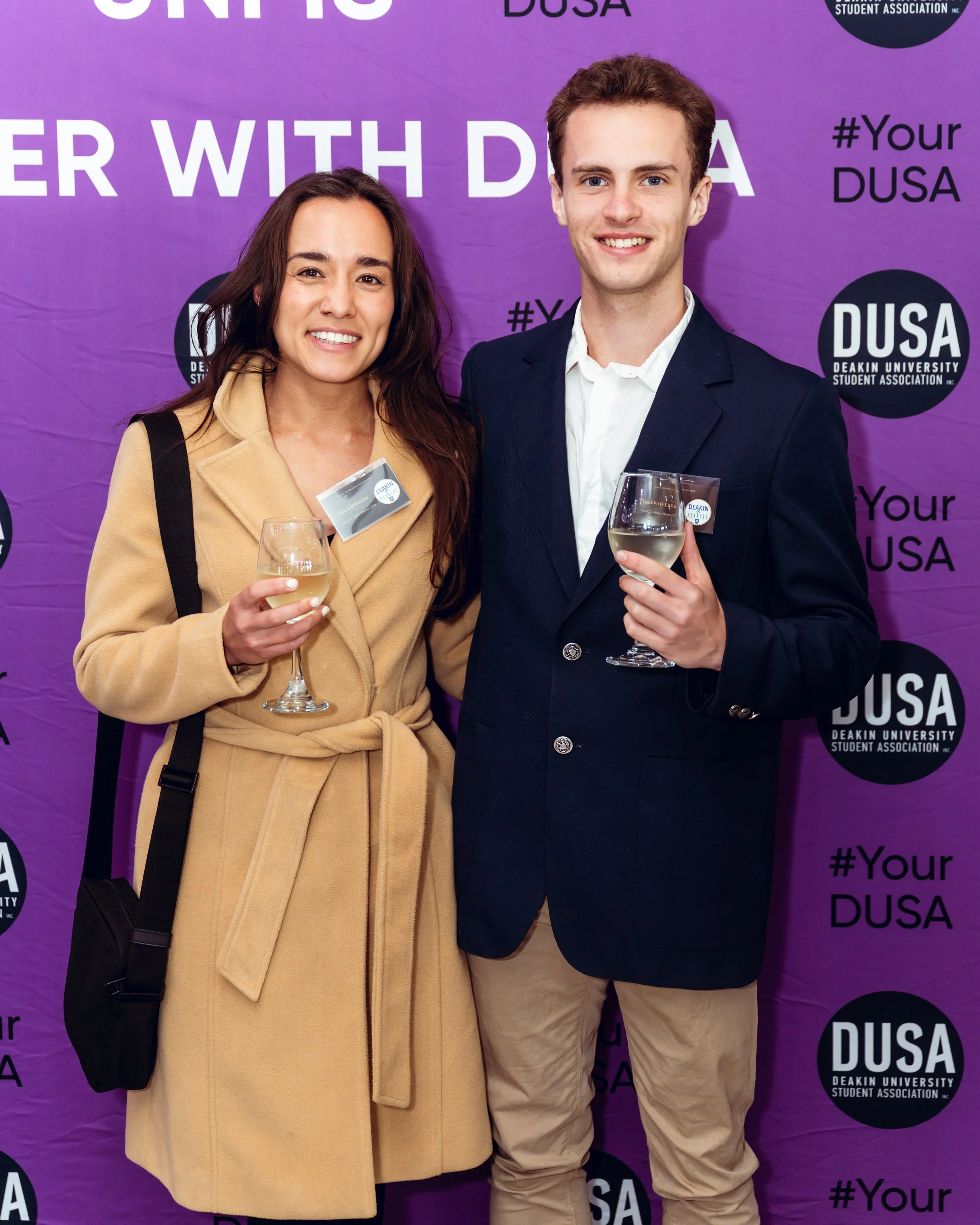 Two people posing in front of a purple backdrop with DUSA logos, holding wine glasses.