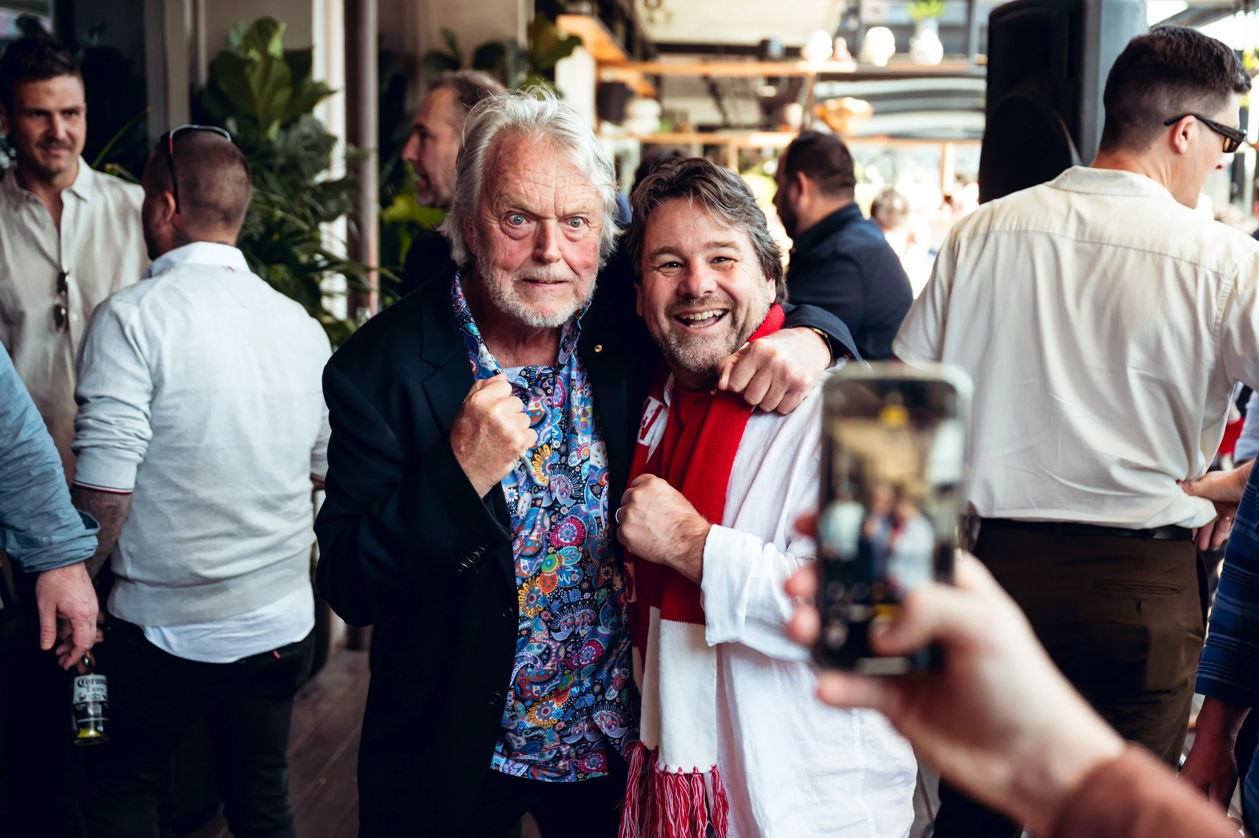 Two men posing together at a lively indoor gathering with blurred people in the background, one holding a smartphone for a photo.