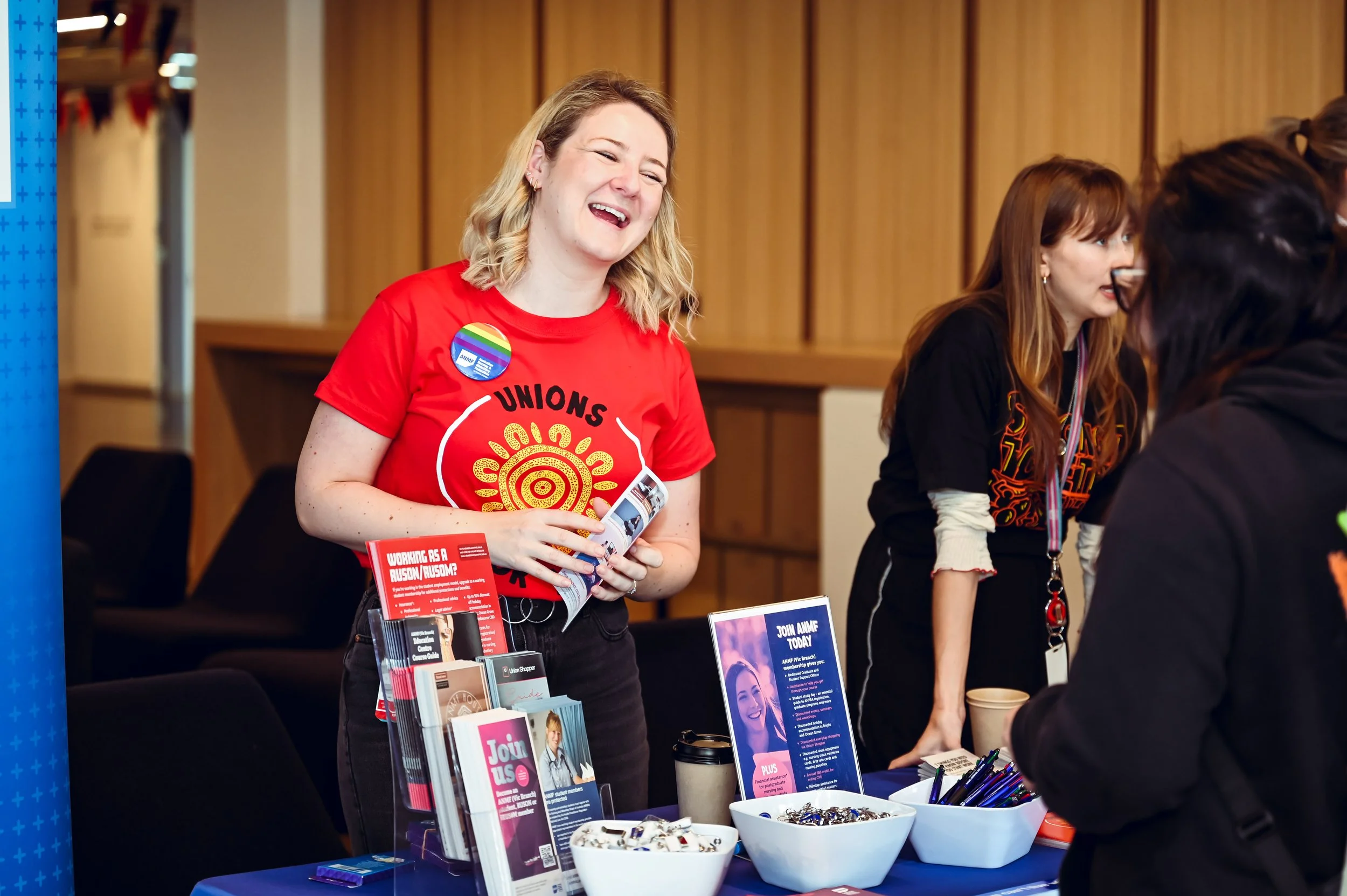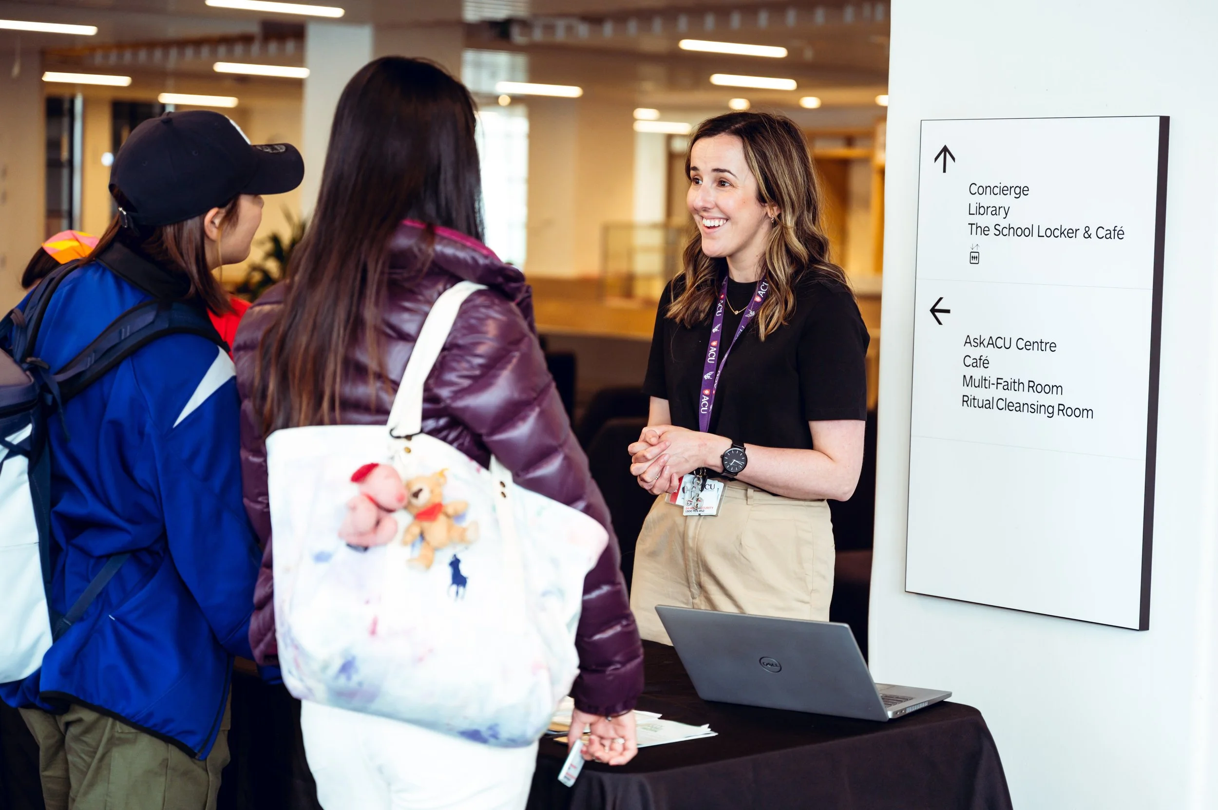 Two people standing by a welcome desk, speaking to a staff member with a laptop, in a university setting.