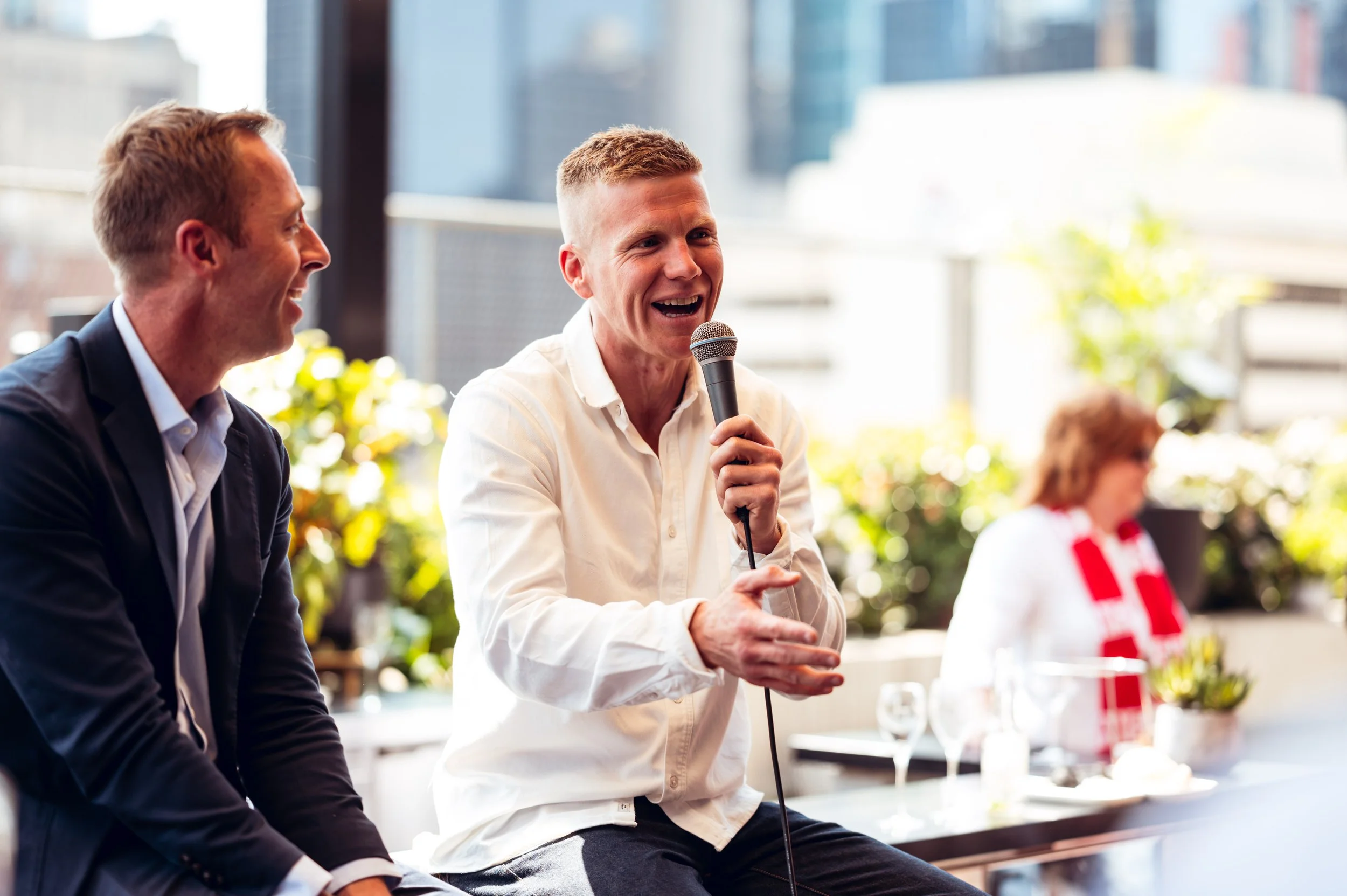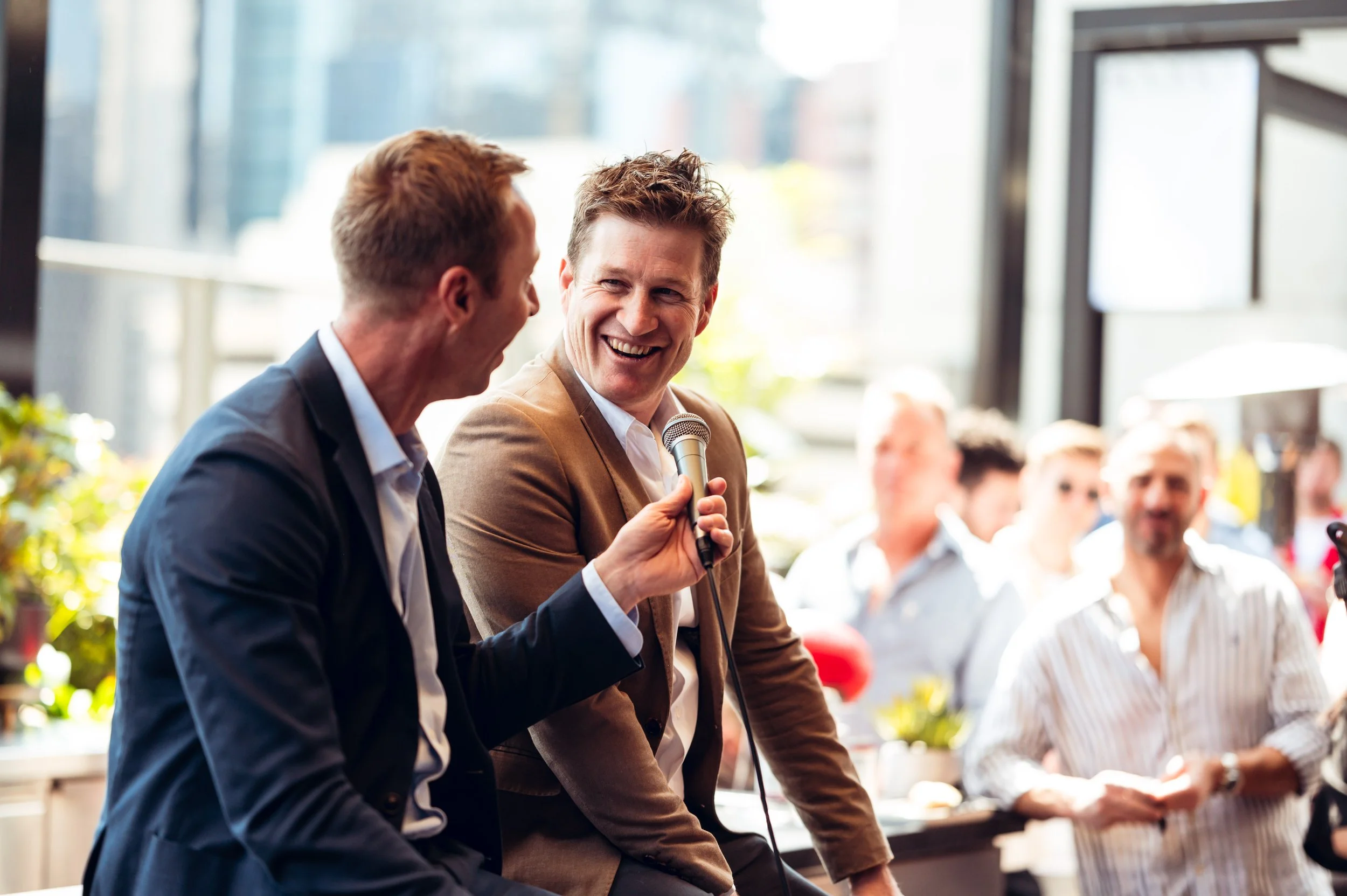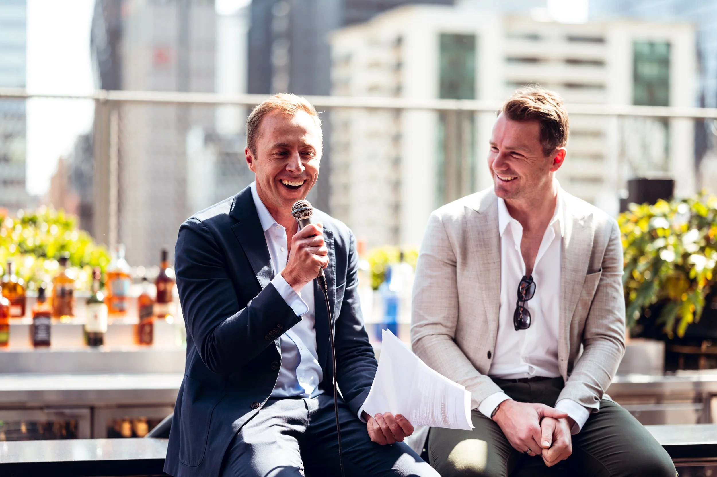 Two men in suits speaking and smiling, with a microphone, in front of a blurred group of people in a bright, outdoor setting.