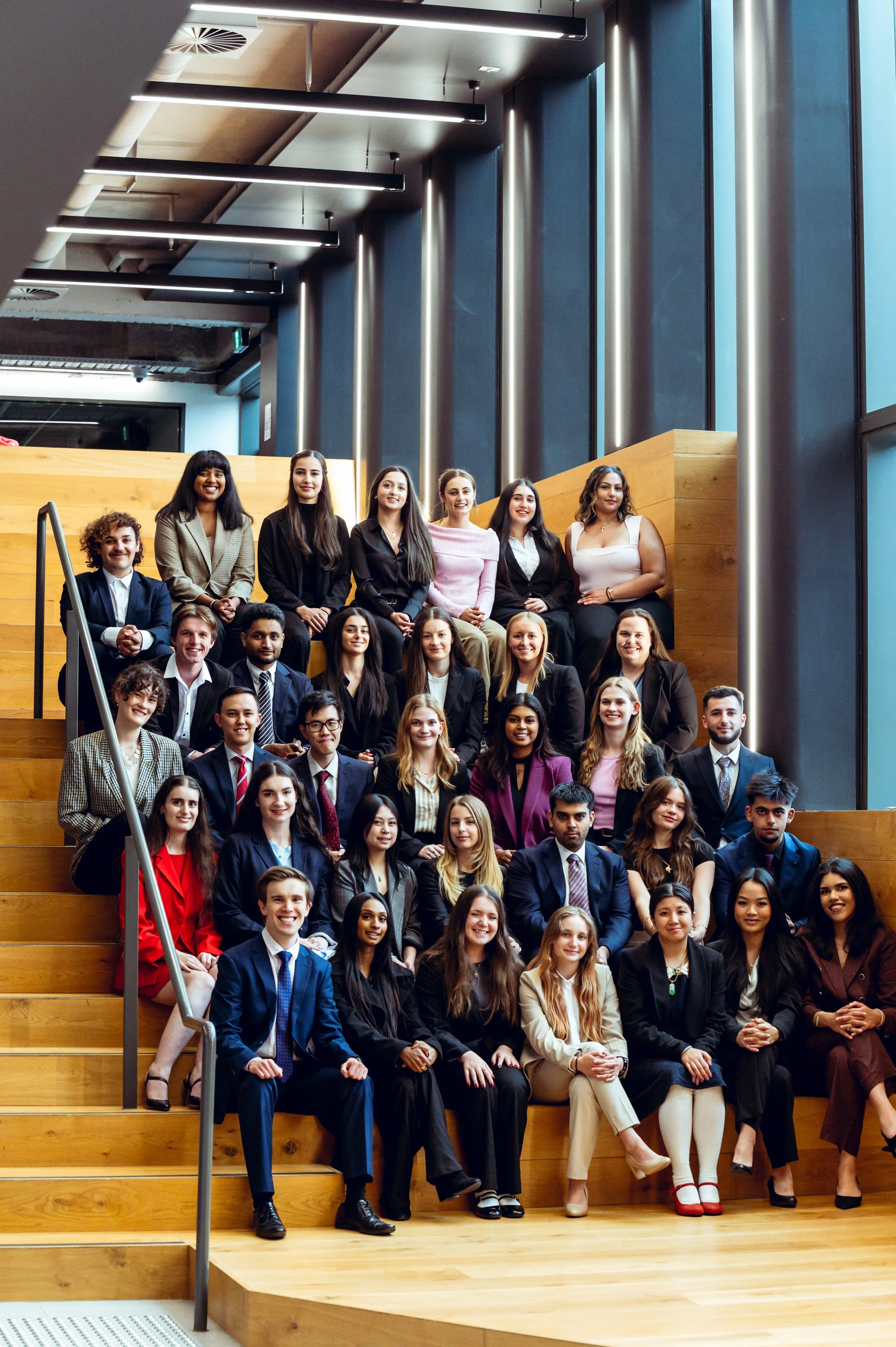 Group of professionally dressed young adults seated and standing on wooden steps in a modern interior setting.