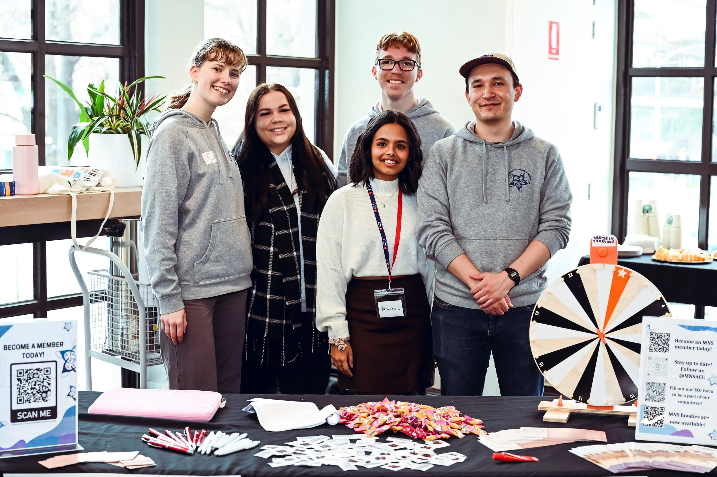 Group of five people smiling behind a table with promotional materials, a prize wheel, and a "Become a member today" QR code sign. Indoor setting with plants and windows in the background.