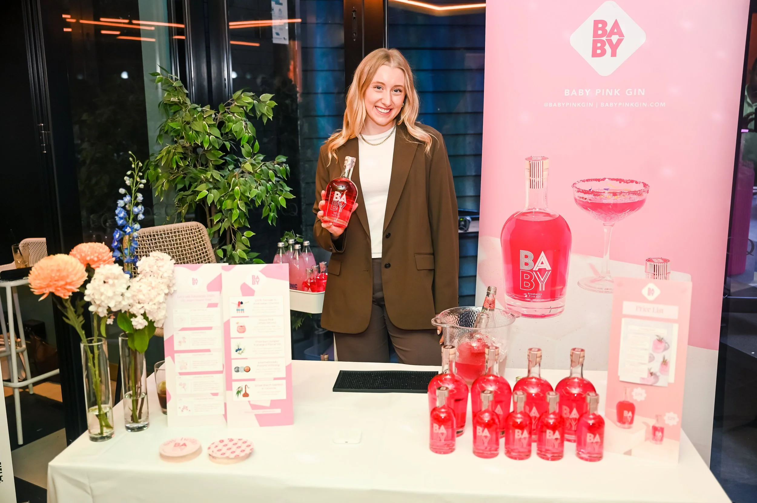 Woman standing at a table showcasing Baby Pink Gin products with pink bottles and promotional materials.