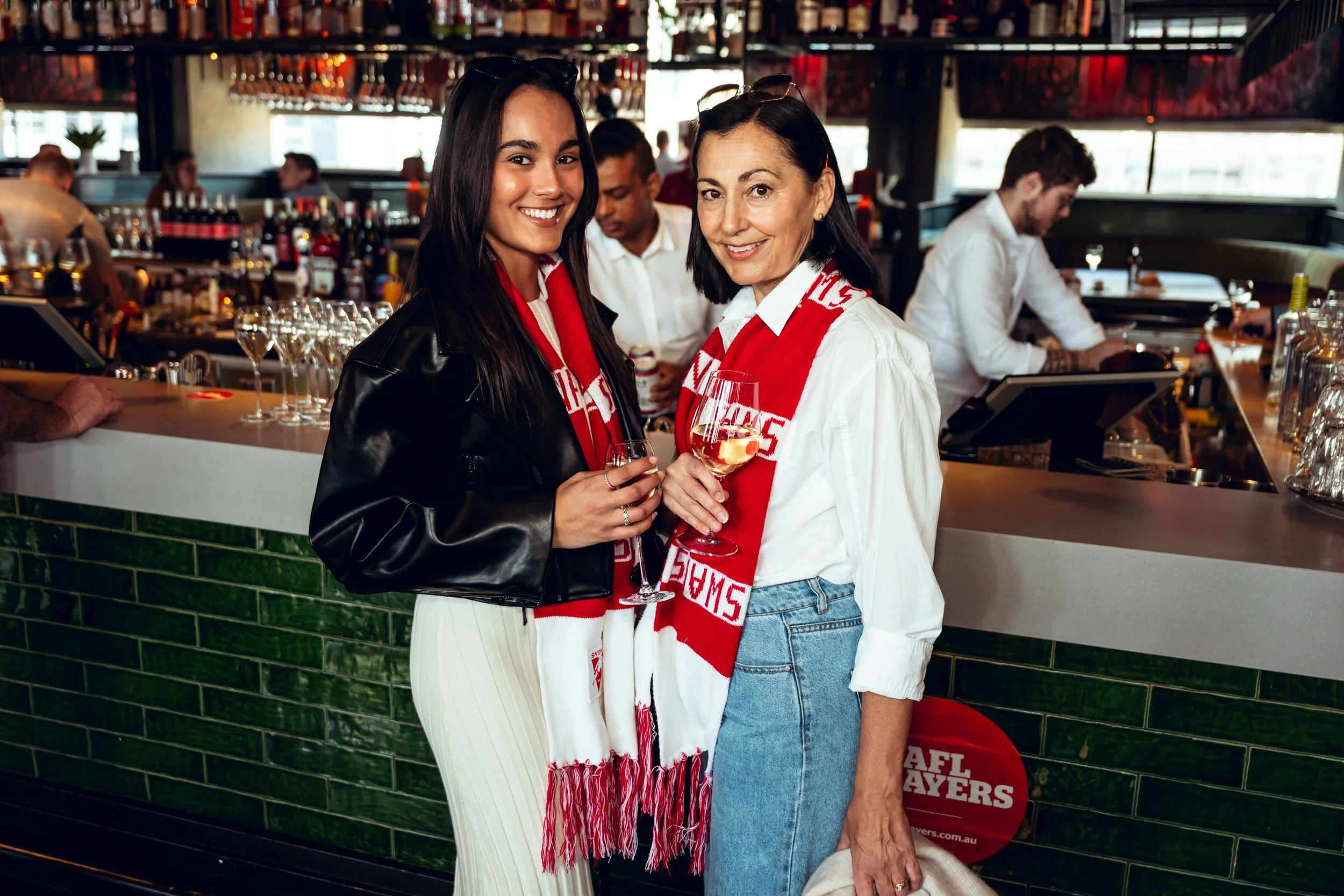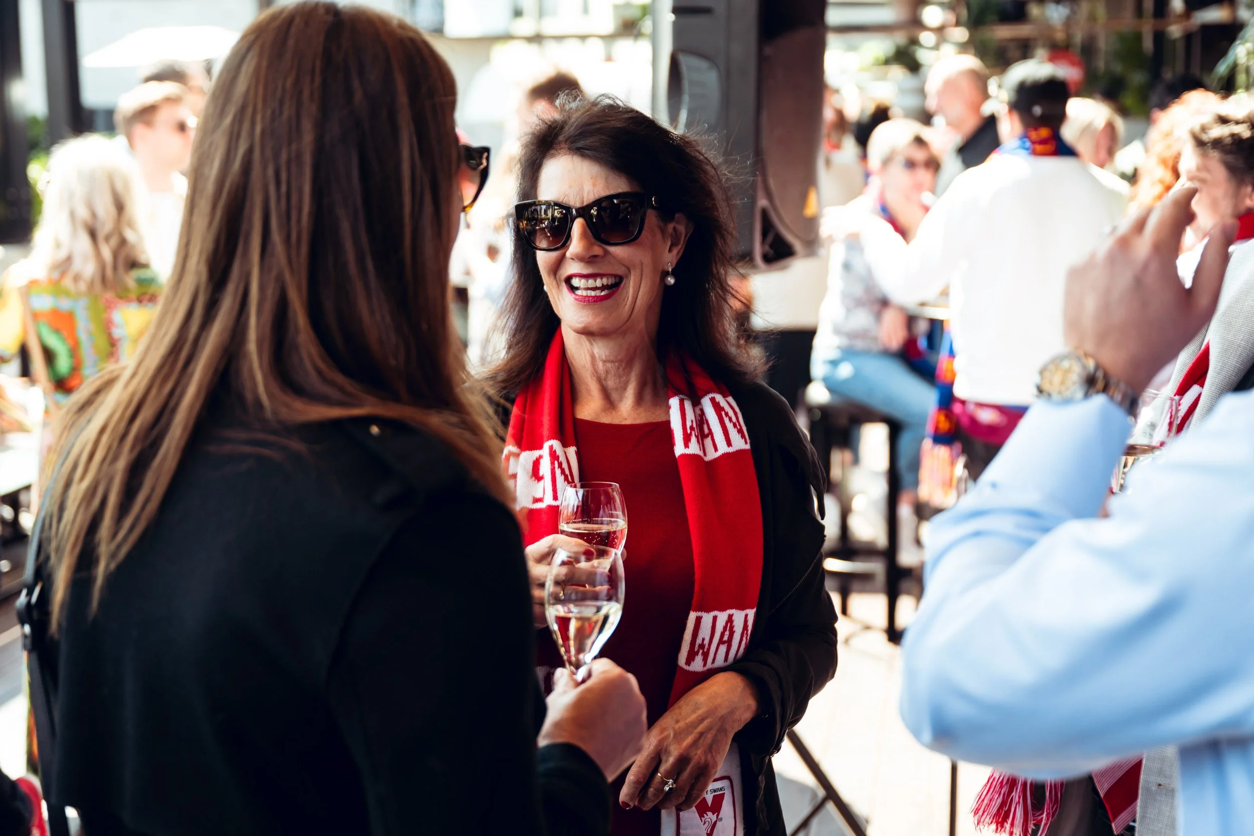 Two women in a bar wearing red and white scarves, holding glasses of wine, with bartenders in the background.