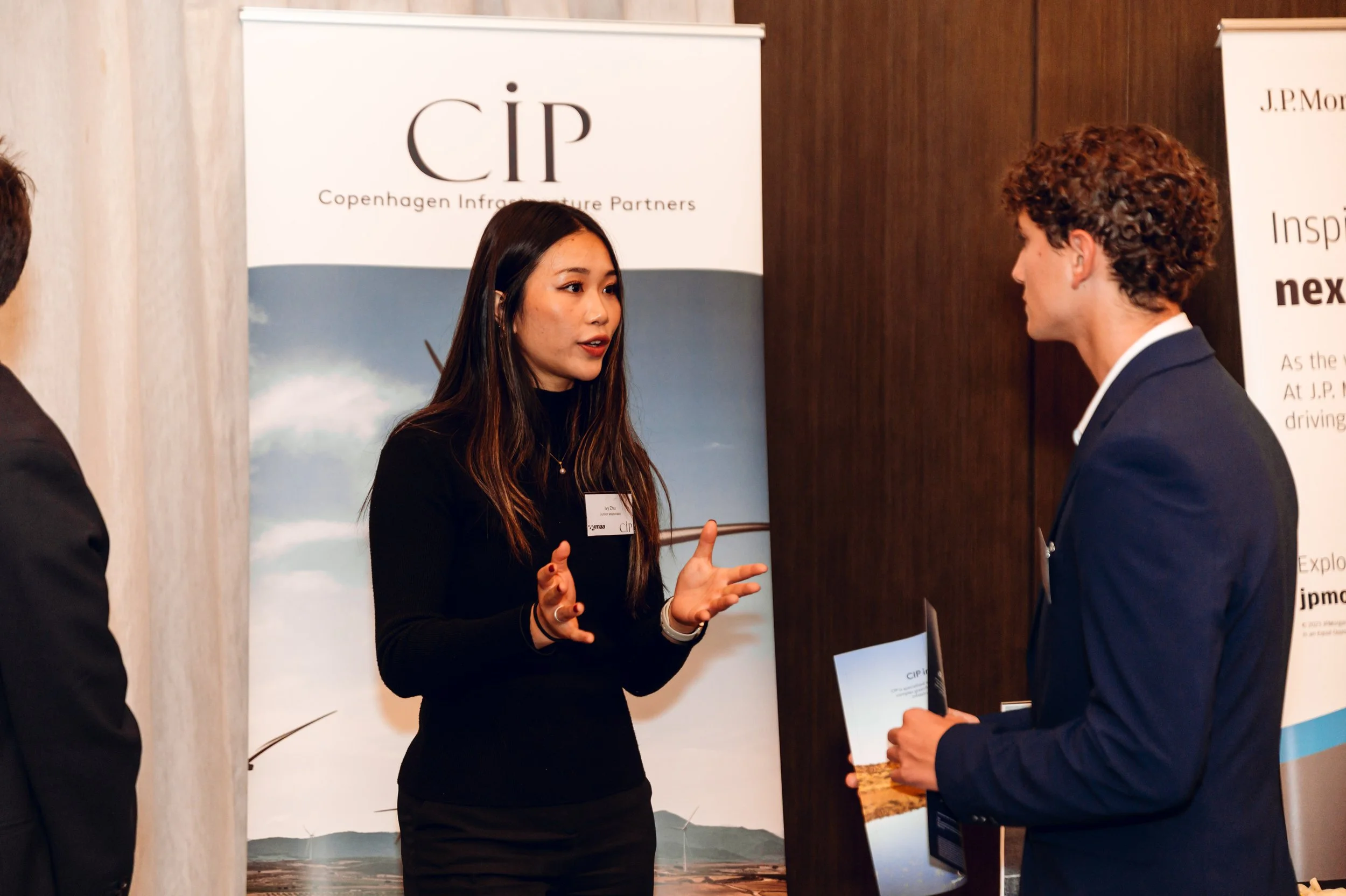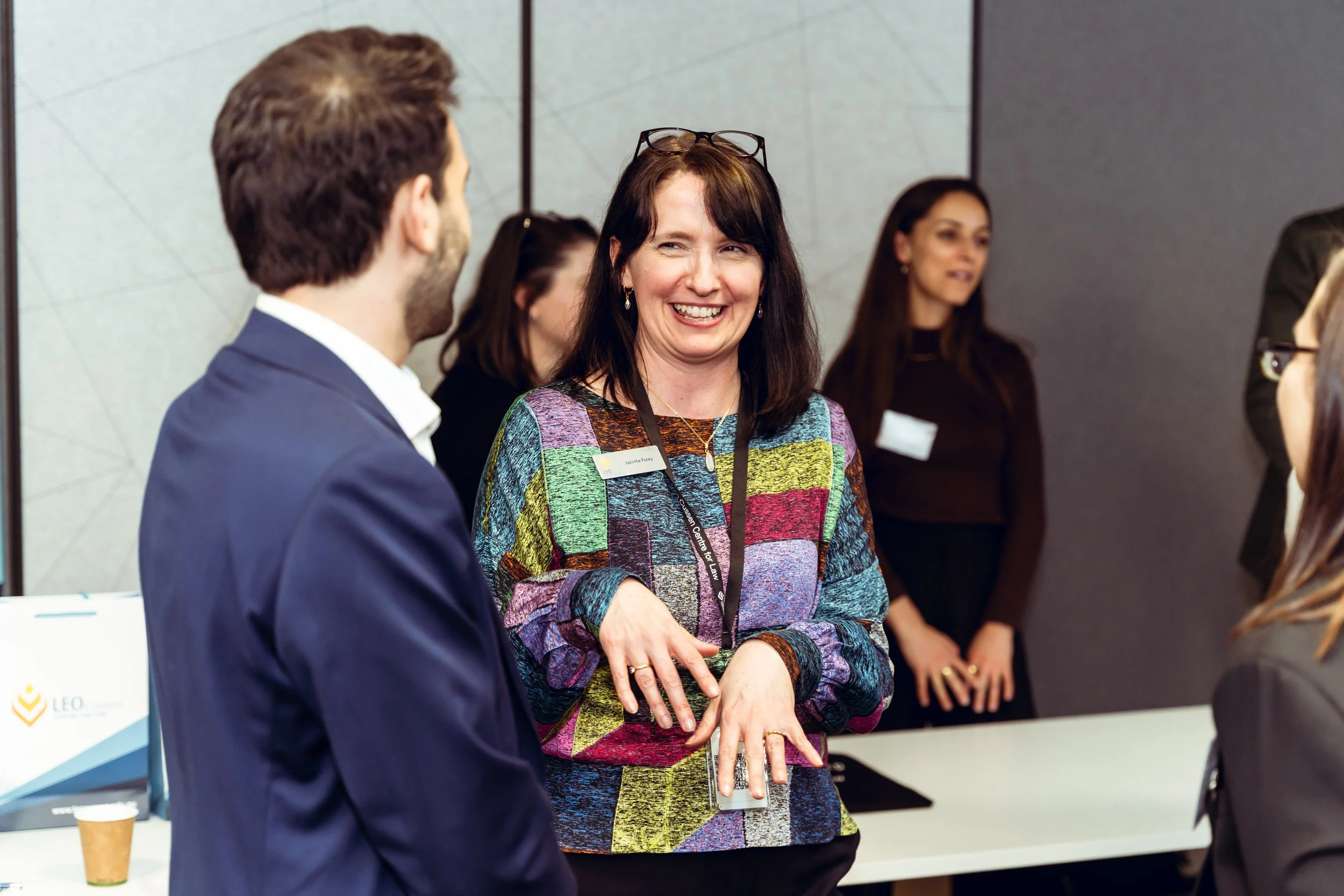 Group of people networking at a professional event, featuring a smiling woman in a colorful blouse engaging in conversation.