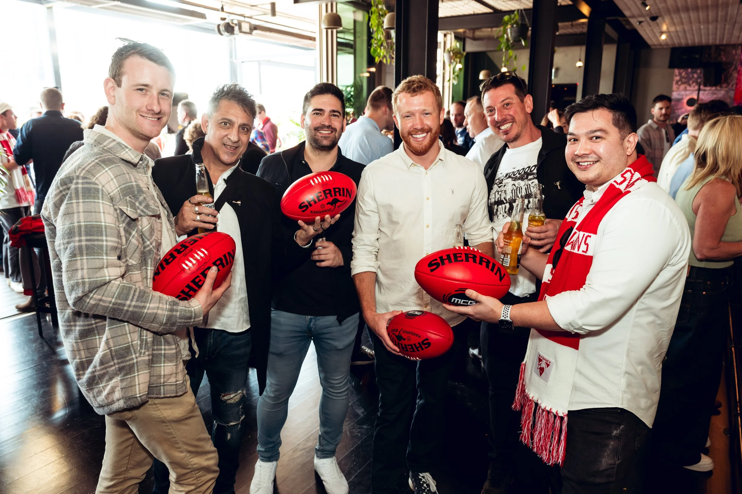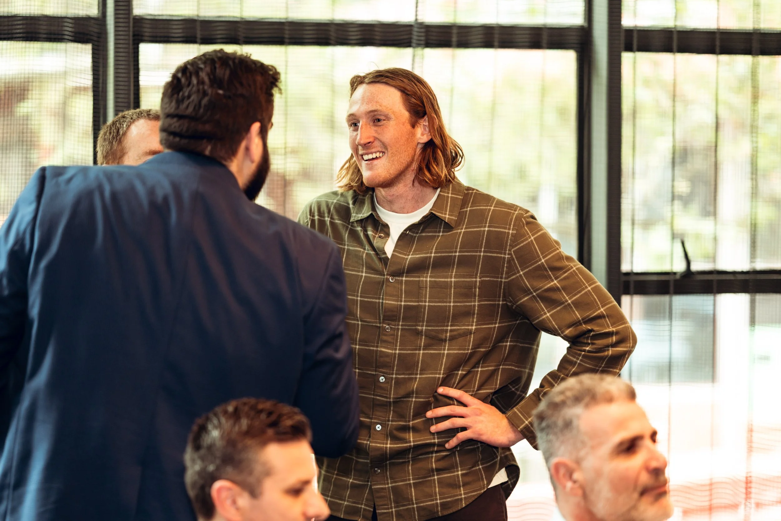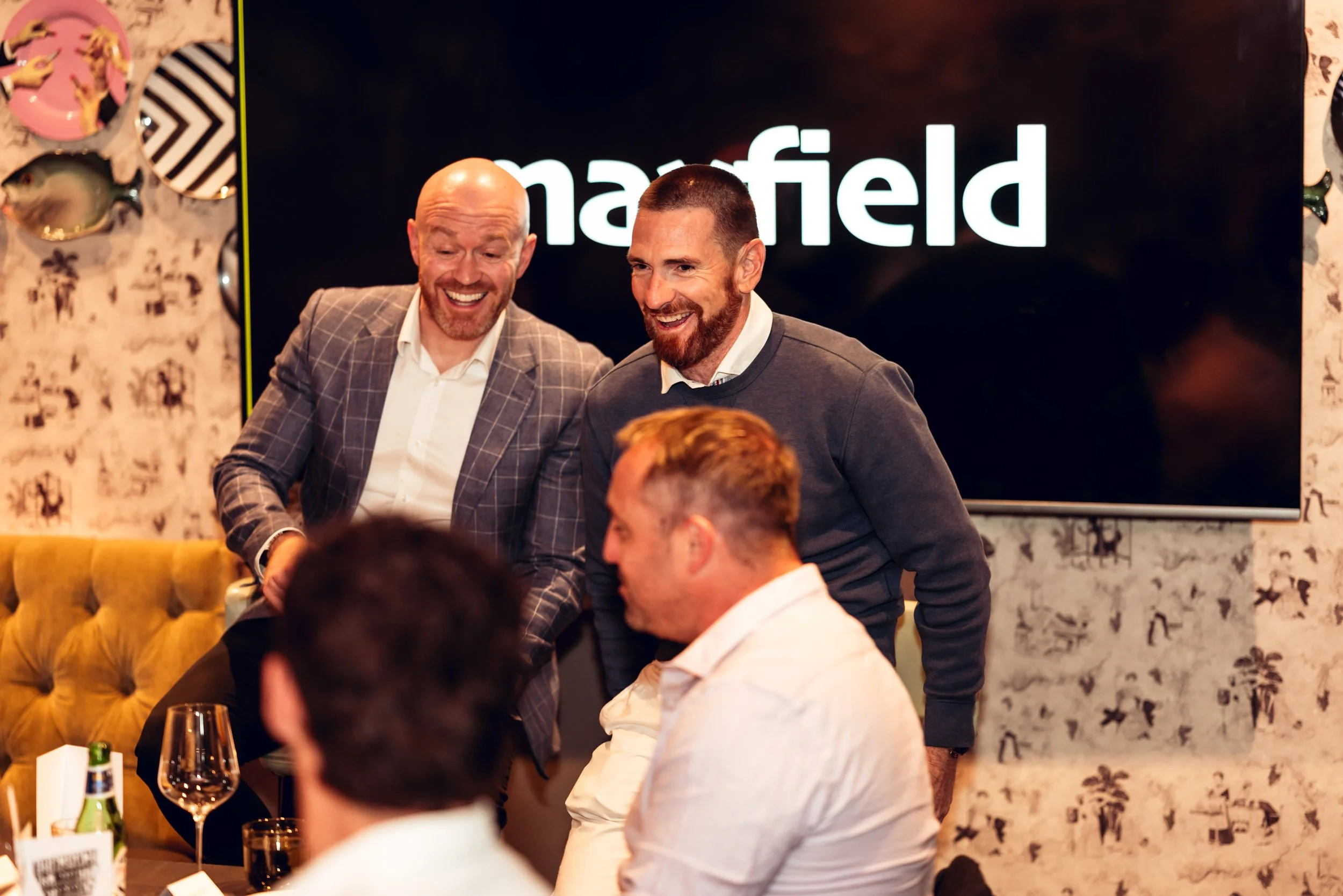 Group of people in a casual gathering with a 'Mayfield' sign in the background.
