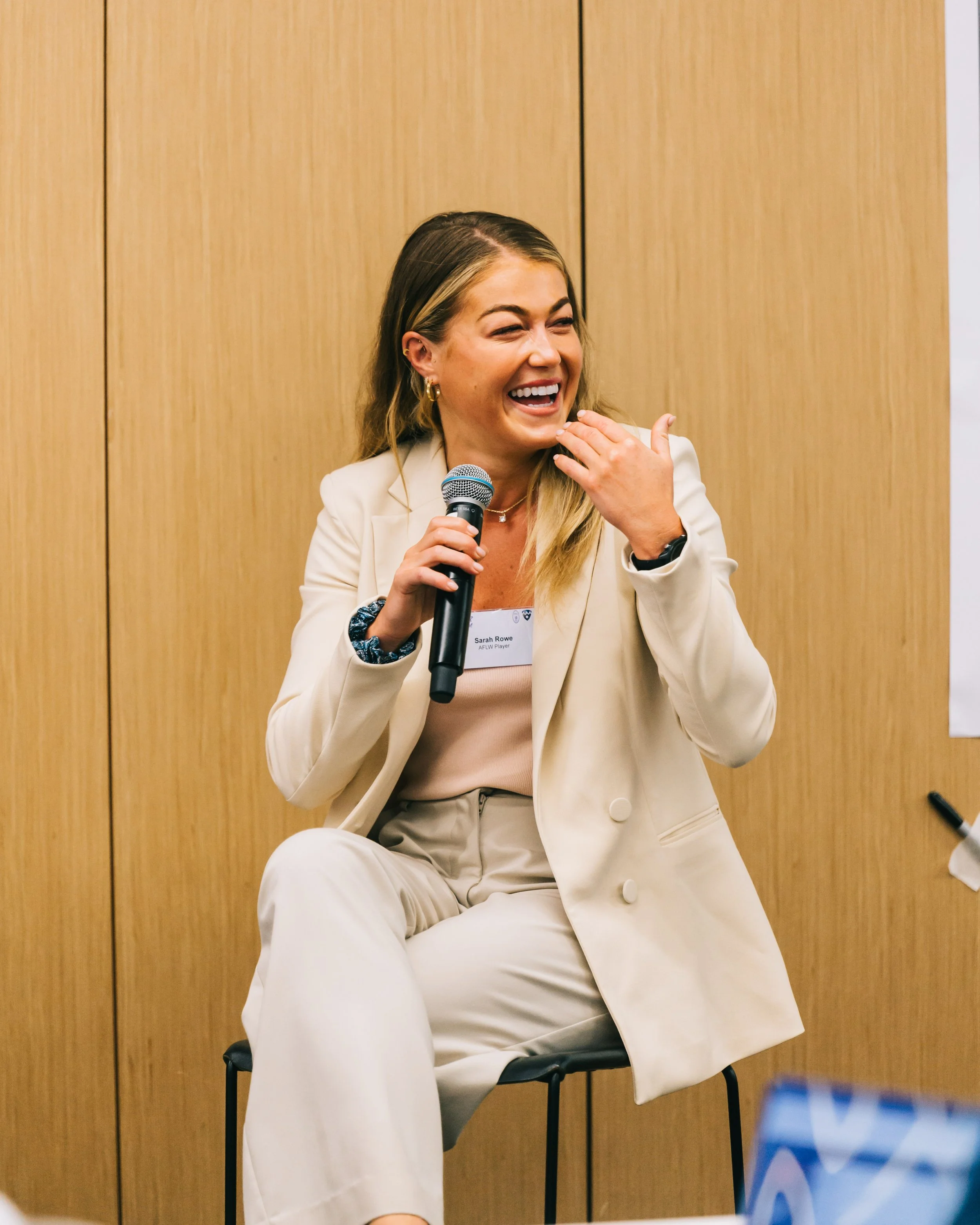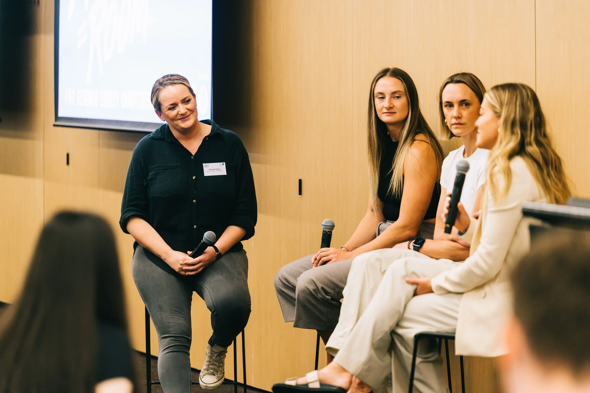 Four women sitting on chairs holding microphones during a panel discussion in a conference room.