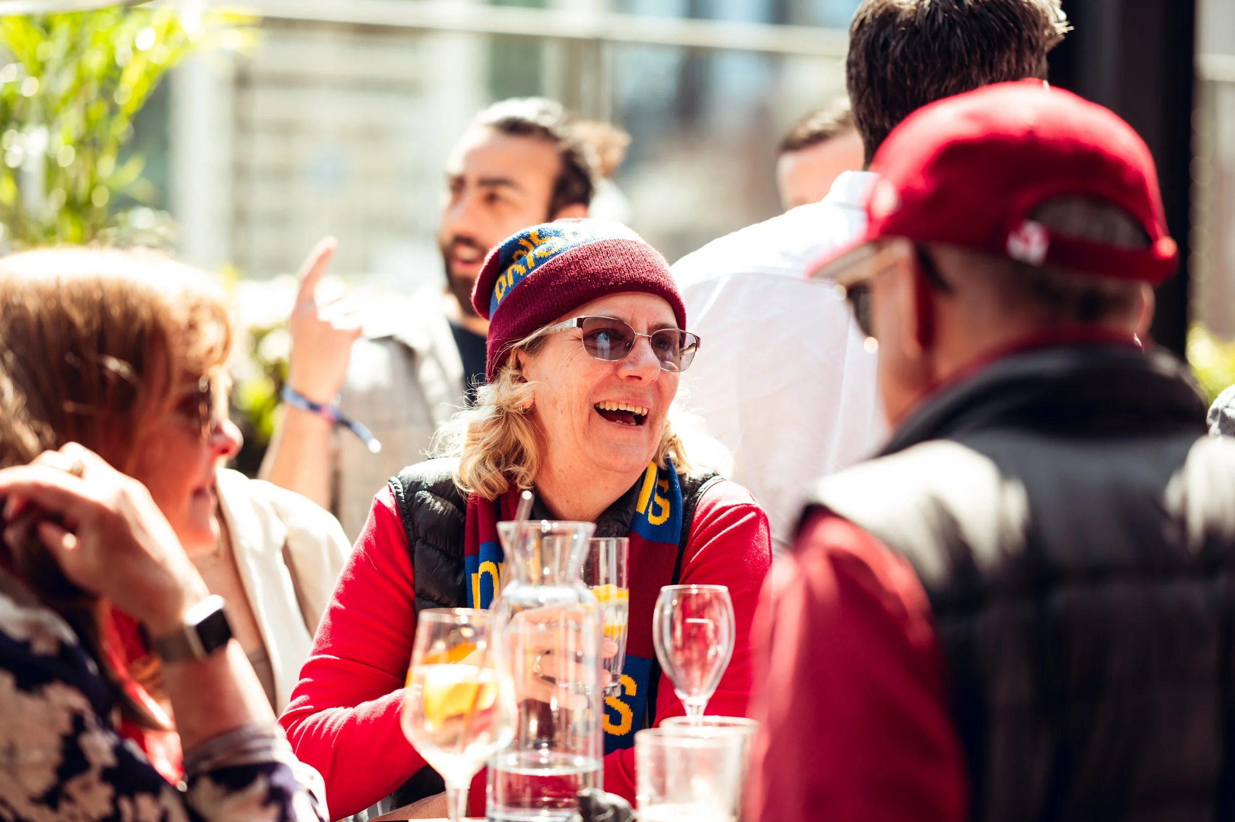 Group of people socializing outdoors, woman in burgundy hat and scarf smiling, drinks on table.