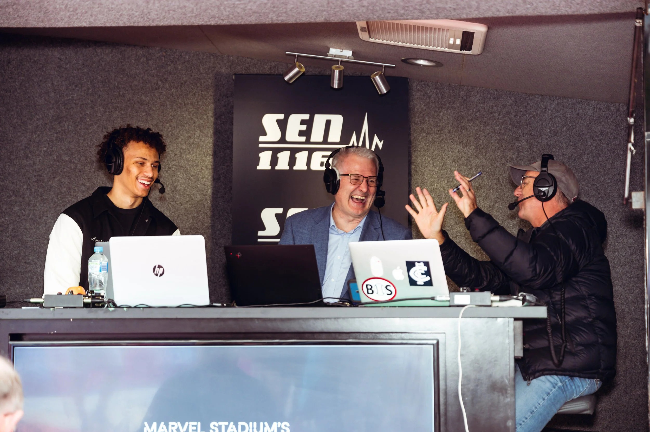 Three people with headsets talking and laughing, sitting at a broadcast table with laptops, displaying 'SEN 1116' in the background.