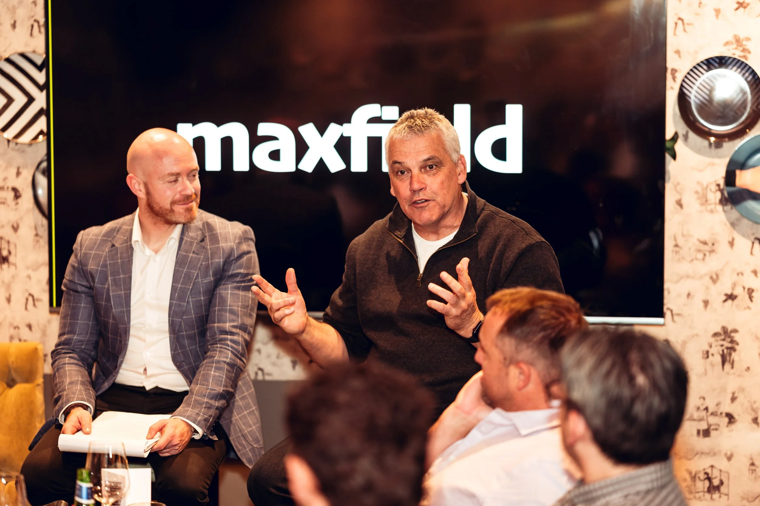 Two men in a discussion, one with white hair and a beard, wearing a dark suit, and the other with brown hair, wearing glasses and a light jacket. They are seated in a room with a screen displaying the word 'maxfield'.
