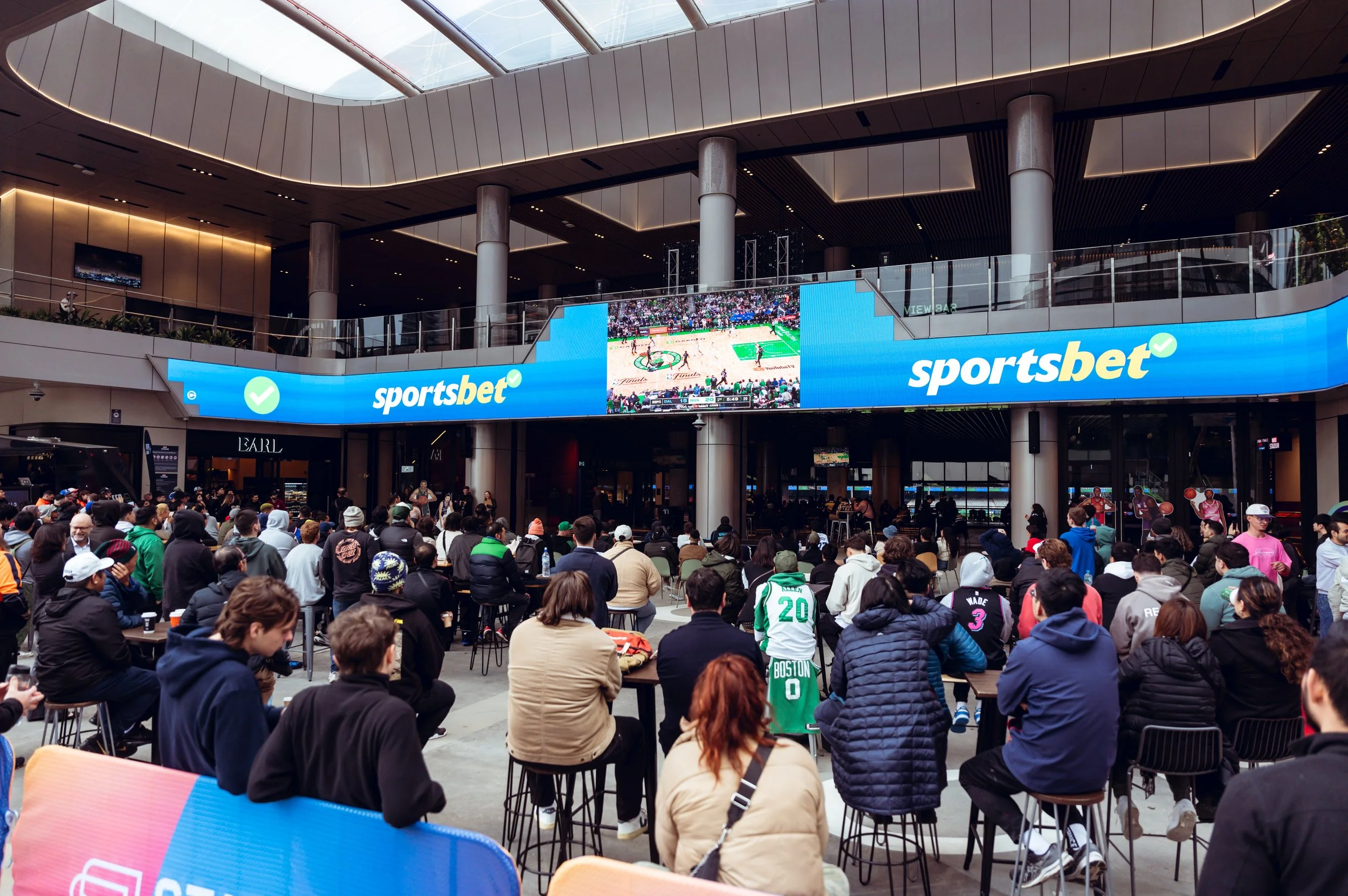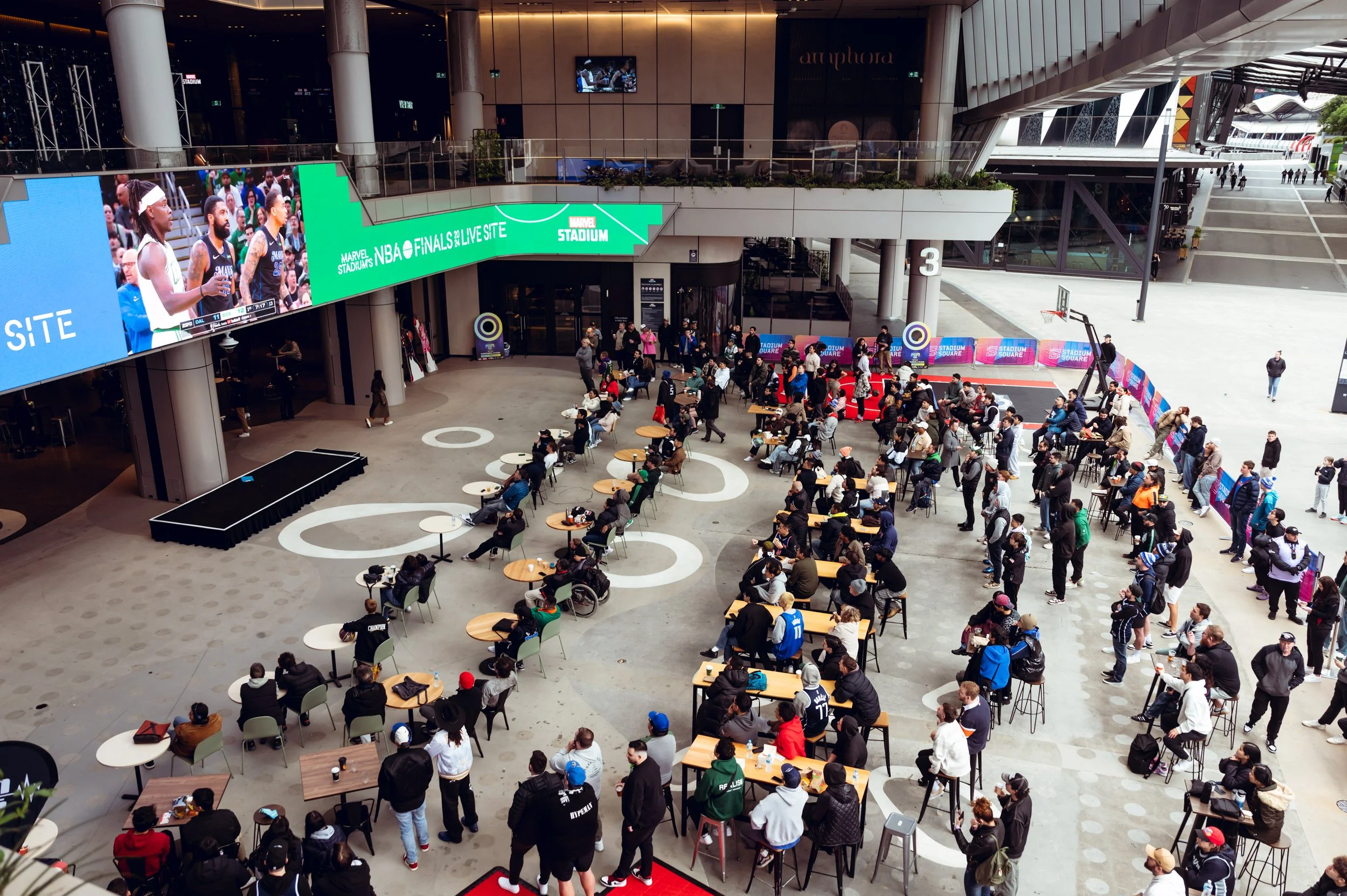 People gathered at an outdoor viewing area watching the NBA Finals on a large screen.