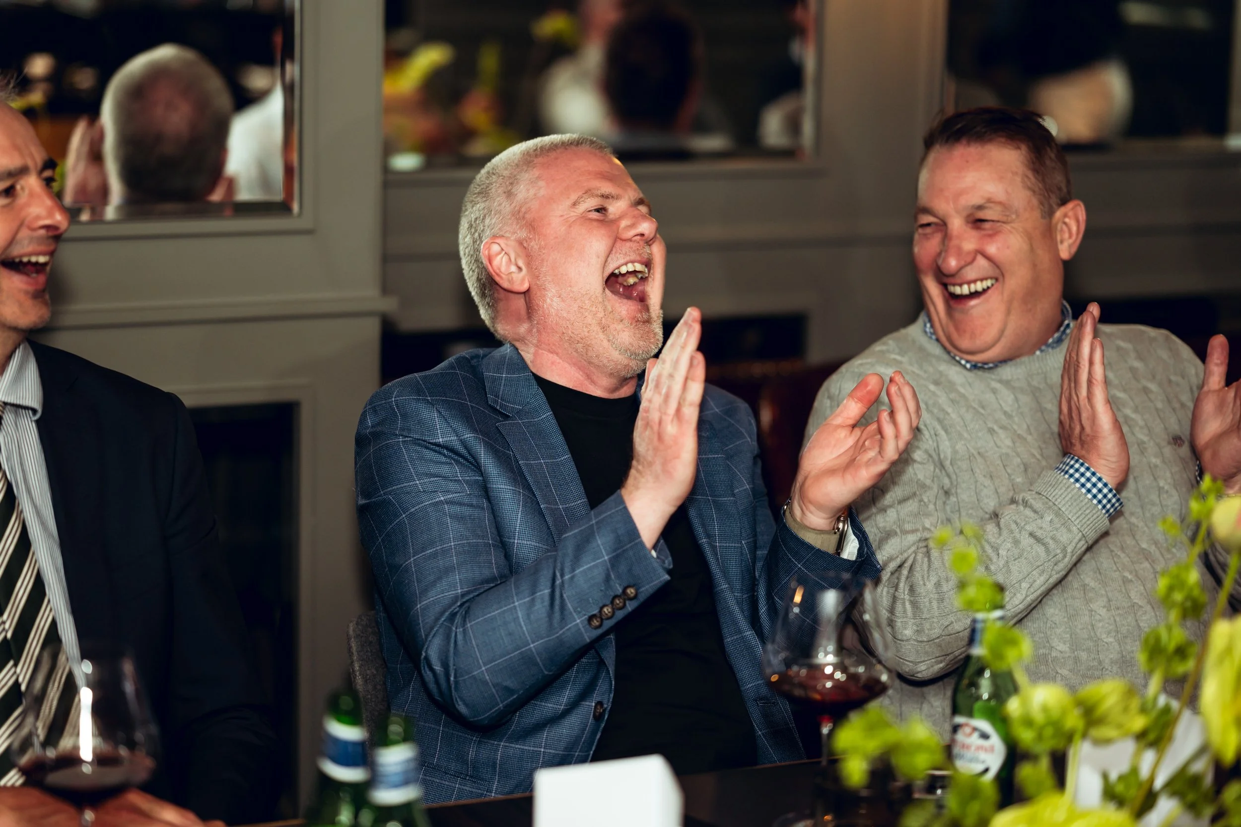 Three men sitting at a table, laughing and clapping, with drinks in front of them.
