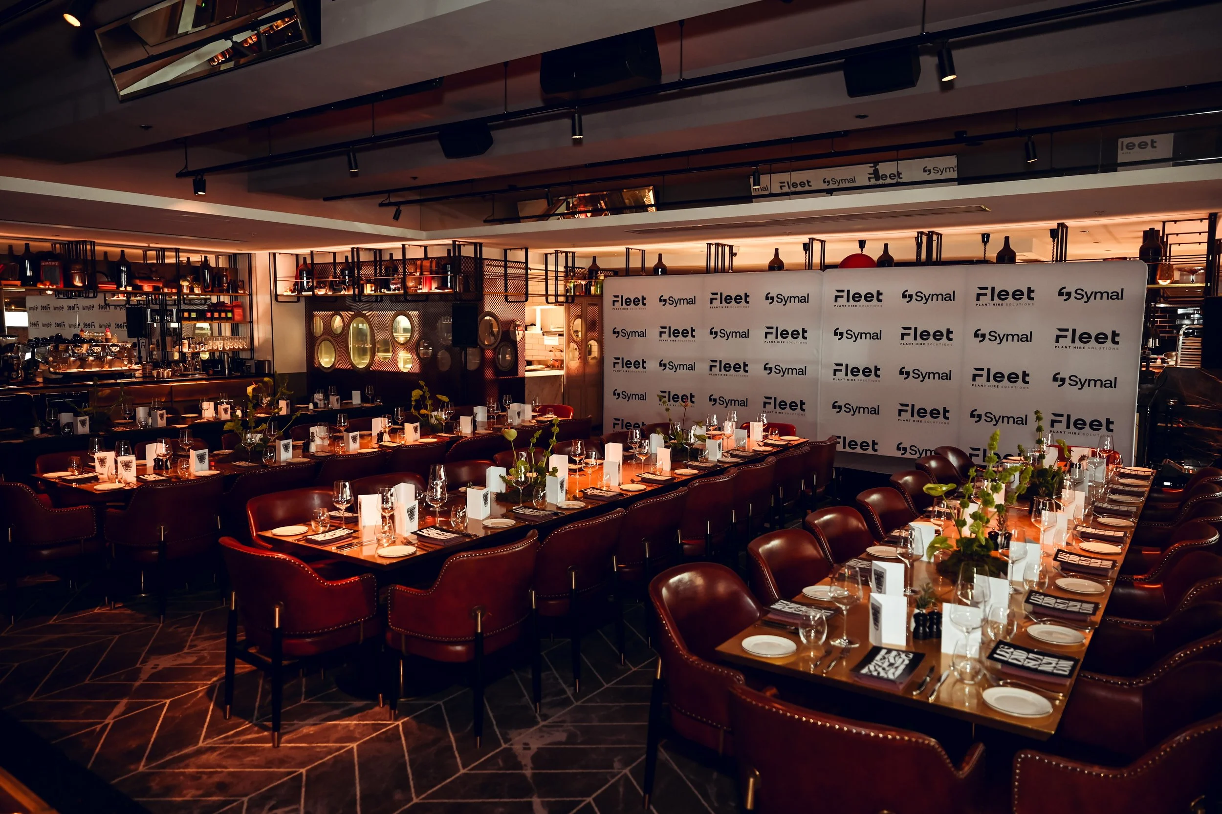Elegant restaurant interior with leather chairs and dining tables set for an event, featuring branding banners for Fleet and Symal, ambient lighting, and a bar area in the background.