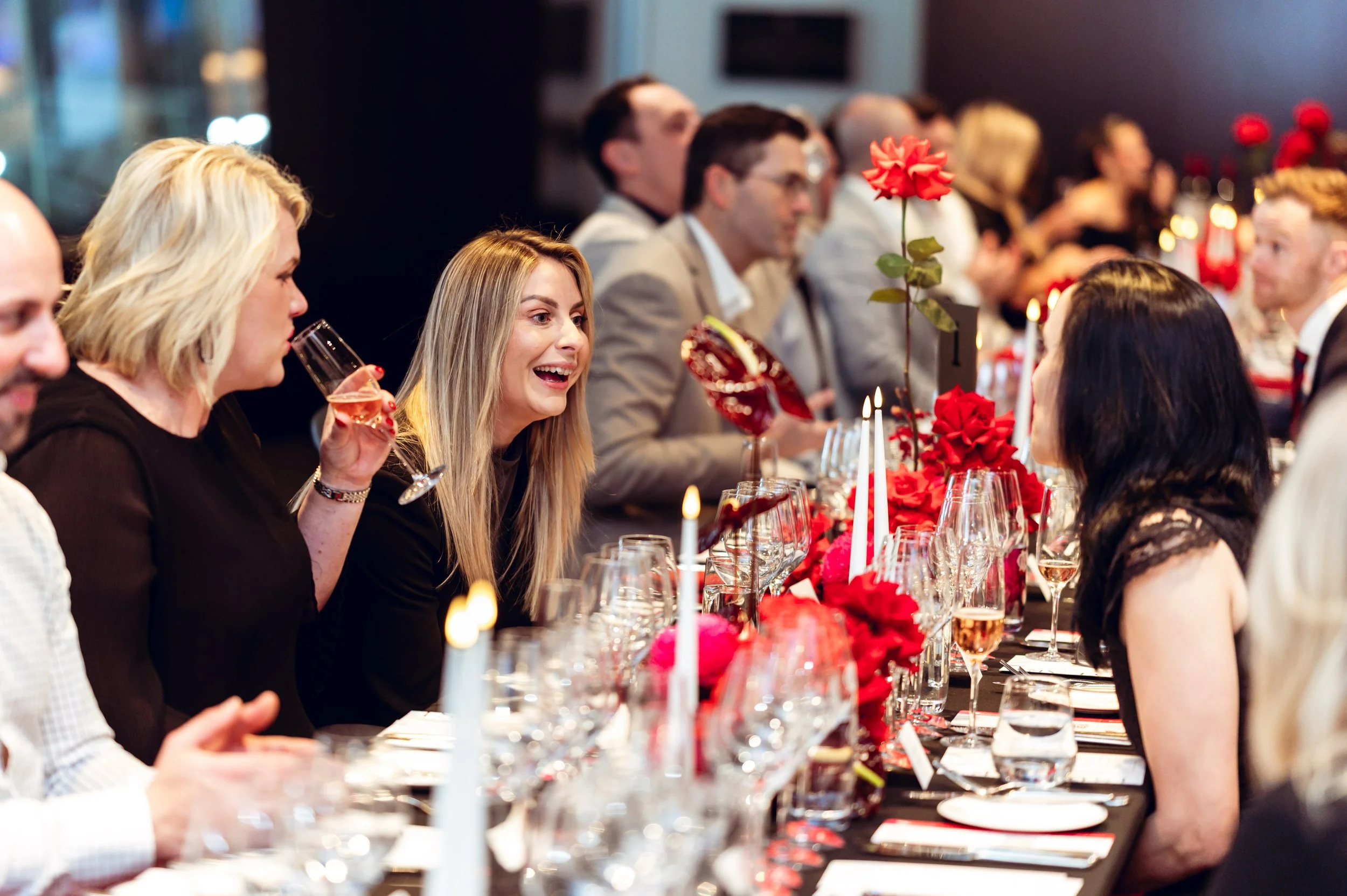 Group of people laughing at a dinner event, seated at a table with drinks and food.