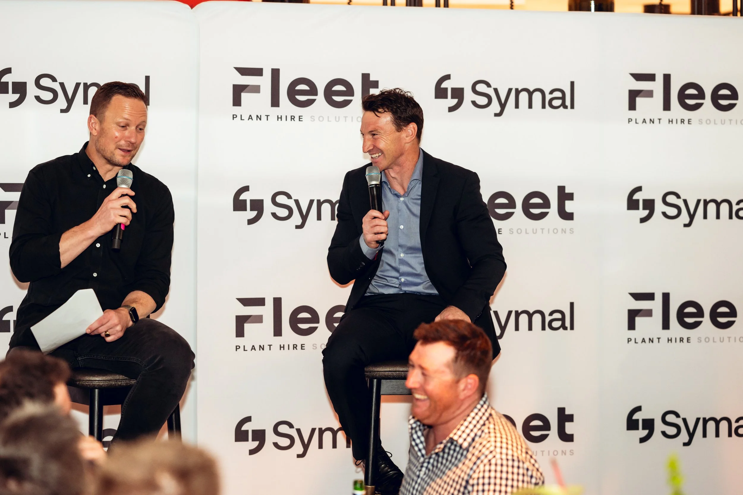 Two men holding microphones sitting on stools in front of a Step and Repeat banner with 'Fleet Plant Hire Solutions' and 'Symal' logos.