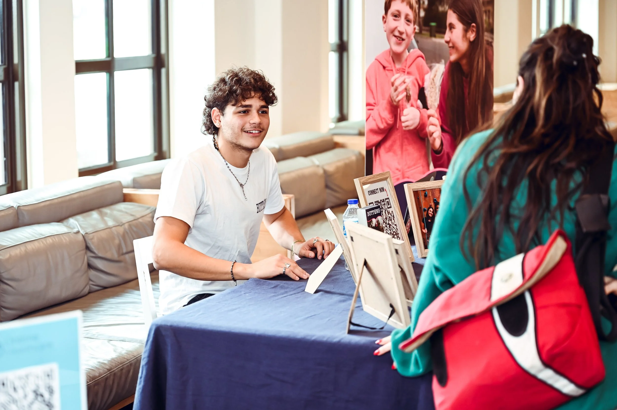 Person smiling at a table with framed pictures and a poster, another person with a backpack is in the foreground.