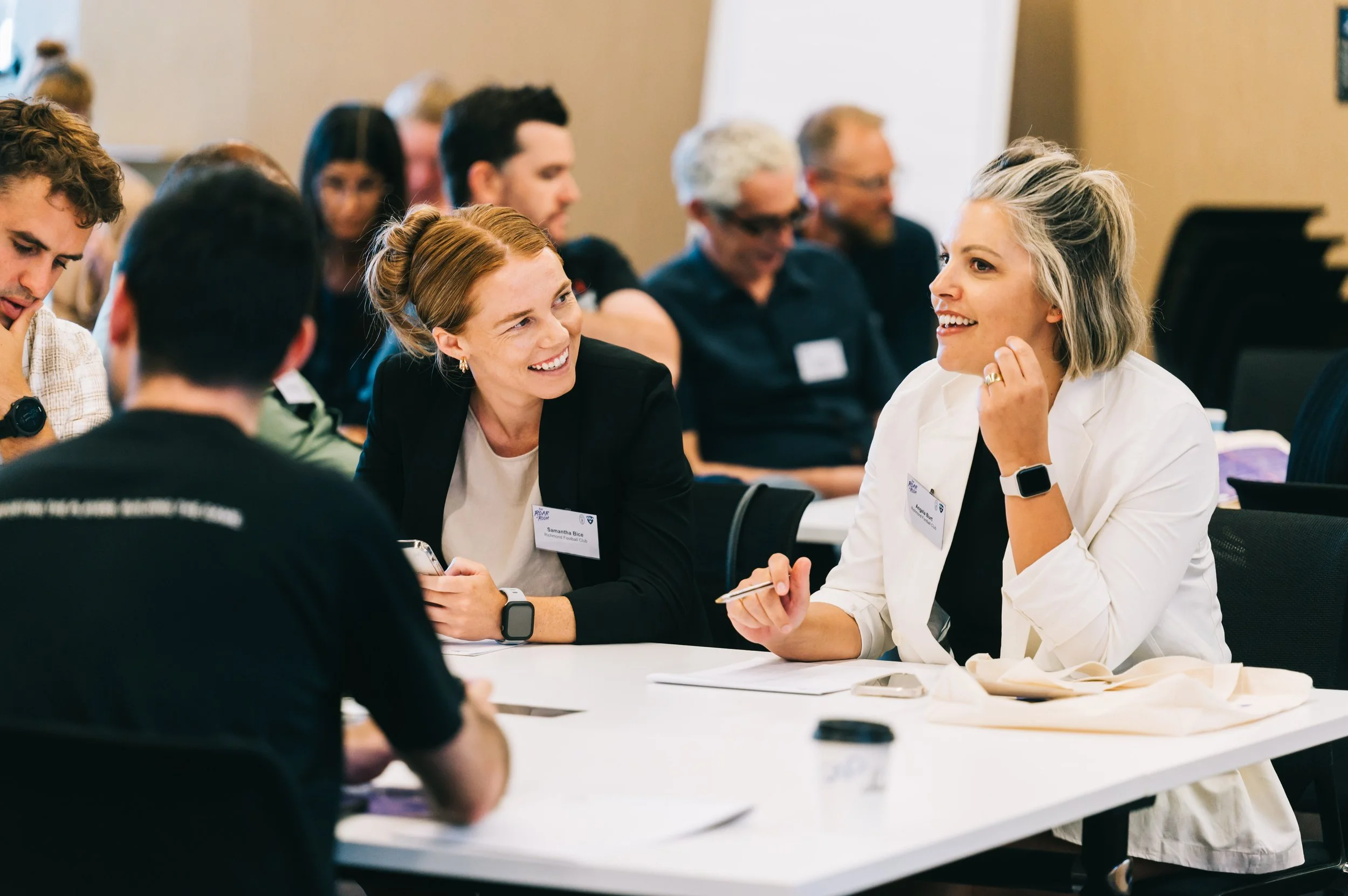 Group of people at a workshop, smiling and collaborating at a table with laptops and water bottles.